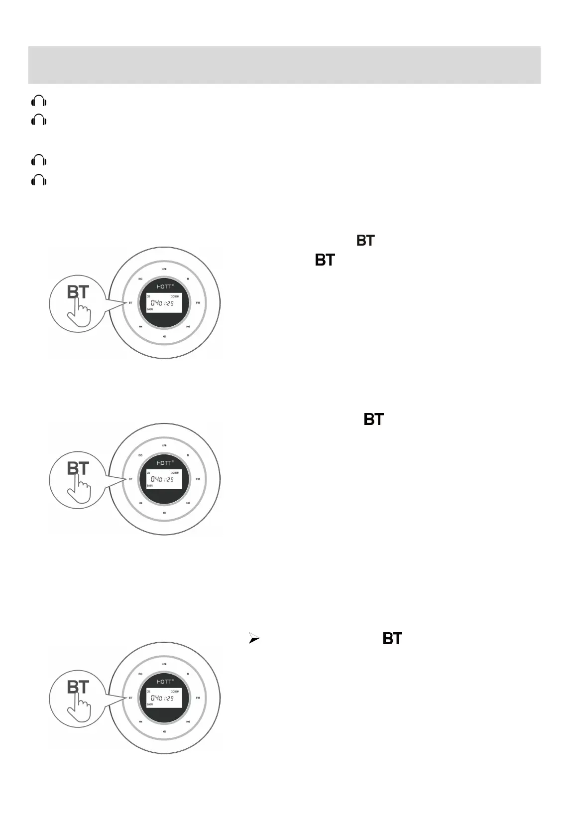 2)蓝牙图标 BT 闪烁,进入蓝牙搜索状态;