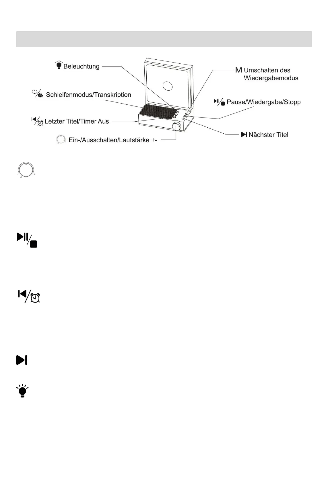 Drücken Sie die Taste einmal kurz, um den aktuellen Titel erneut abzuspielen; drücken Sie die Taste