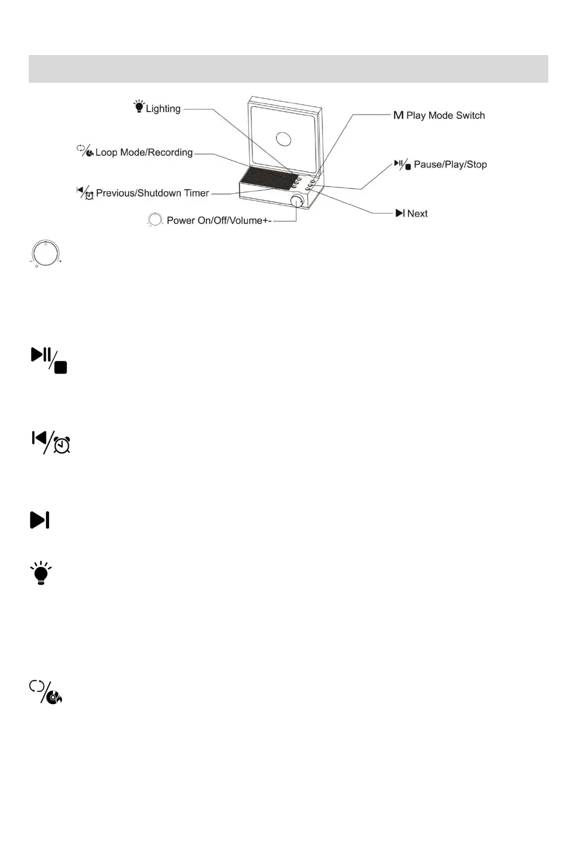 Press it to switch loop modes: ONE: Single play loop; ALL: Play all in loop; SHUF: Shuffle songs; OFF: