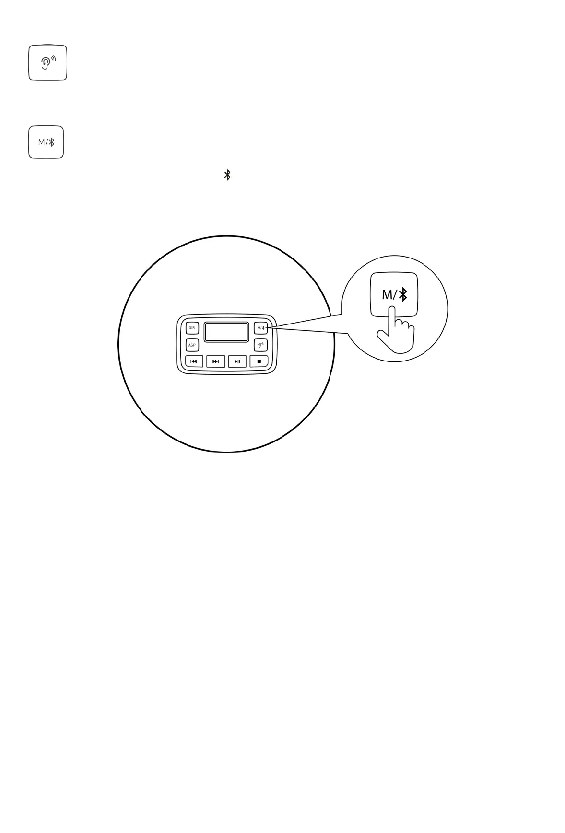 播放状态,长按打开蓝牙设备,出现 图标闪烁,进入配对模式状态, 50s 内会自动与周围打开