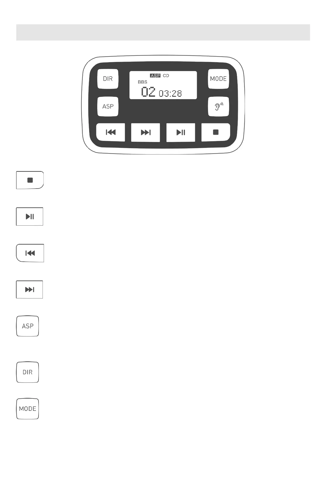播放状态,短按跳至:单曲循环播放;ALL 全部循环播放;DIR 曲目区选择播放;INTRO 浏览播放;