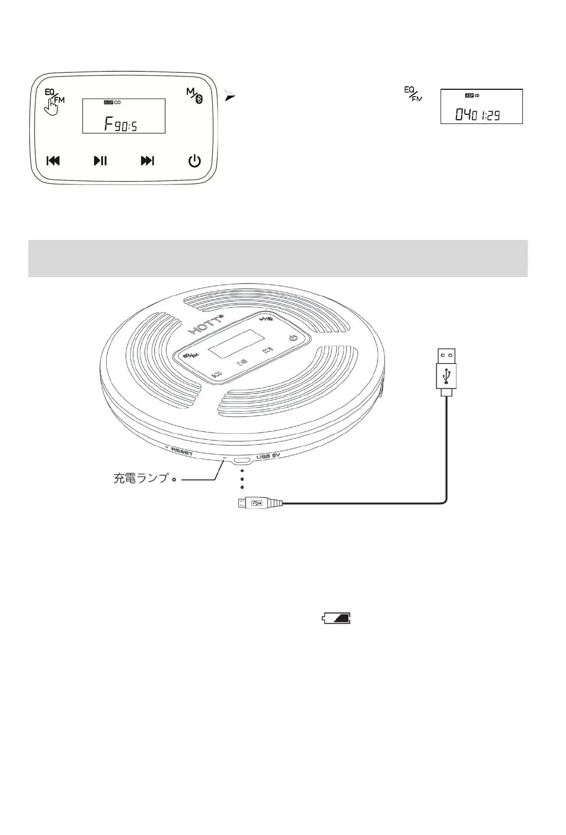 2CD プレーヤーの充電には、5V1A 充電アダプターと付属の USB ケーブルを使用するこ