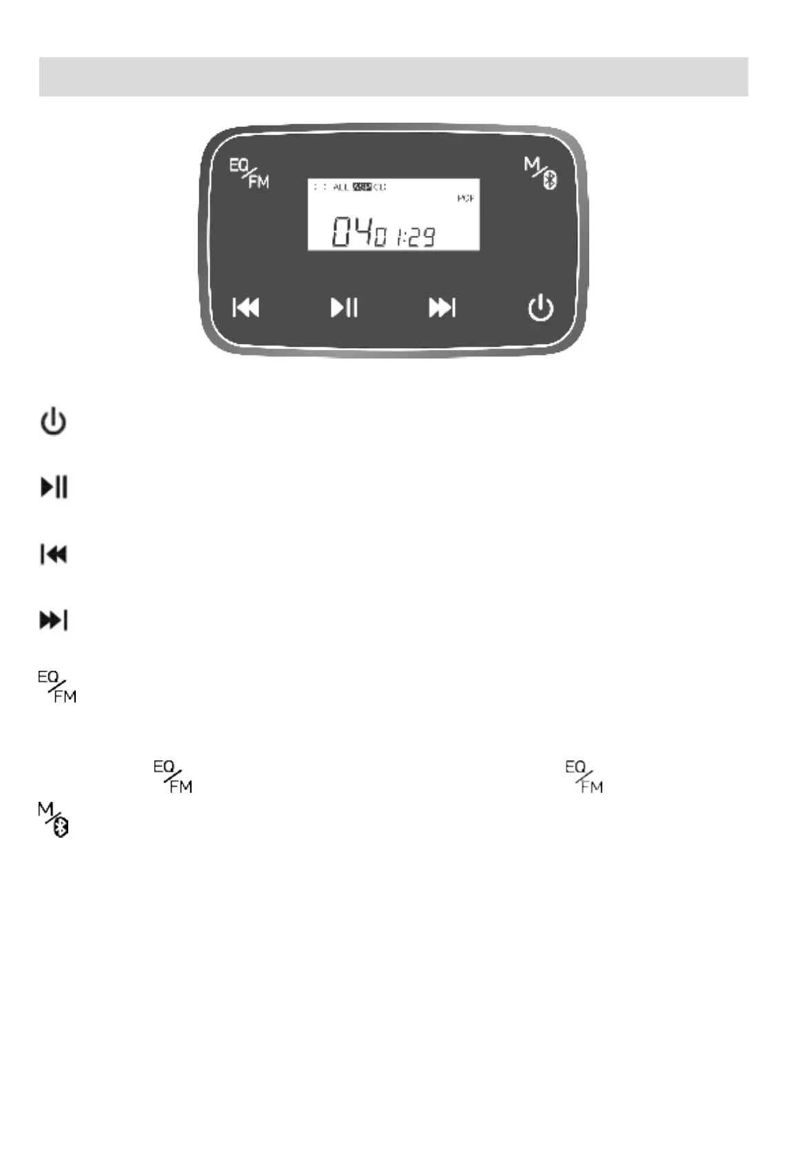 播放状态,短按跳至:单曲循环播放;ALL 全部循环播放;DIR 曲目区选择播放;INTRO 浏览播放;