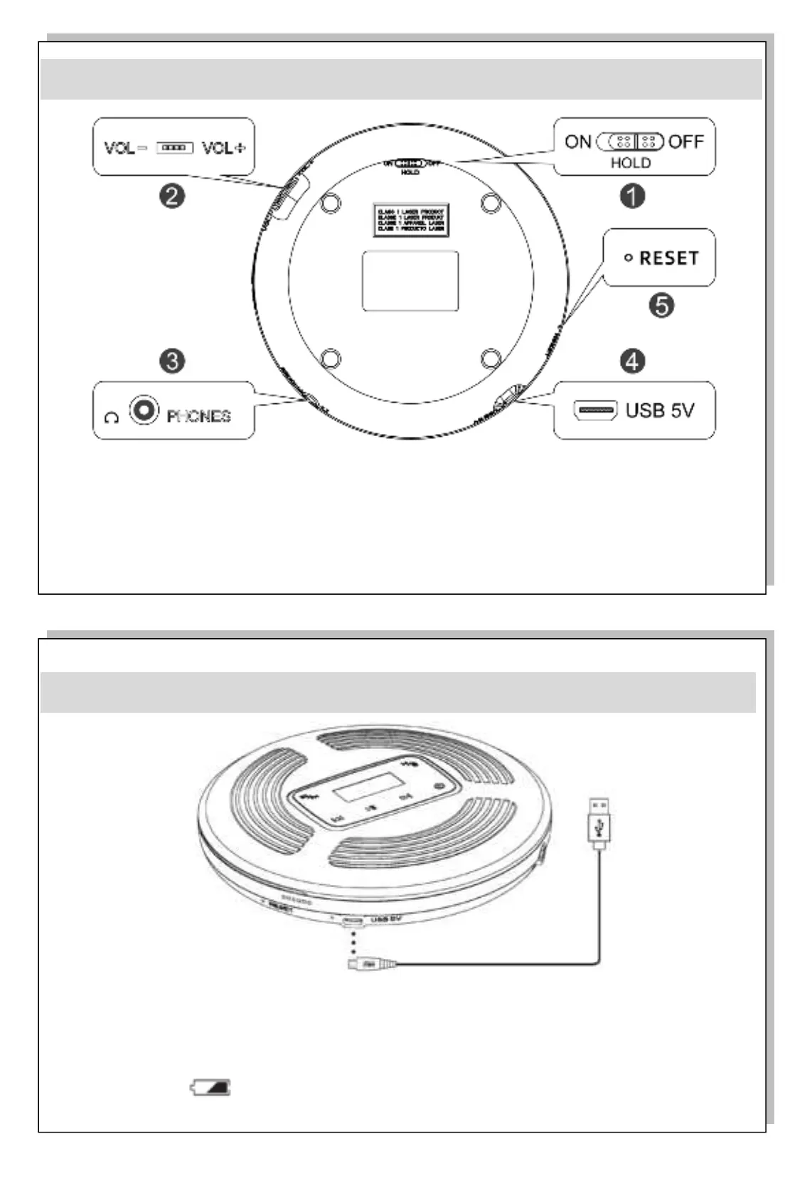 3.耳机孔:耳机接口。 4.USB 5V:电源输入。 5.复位孔:短按关机功能