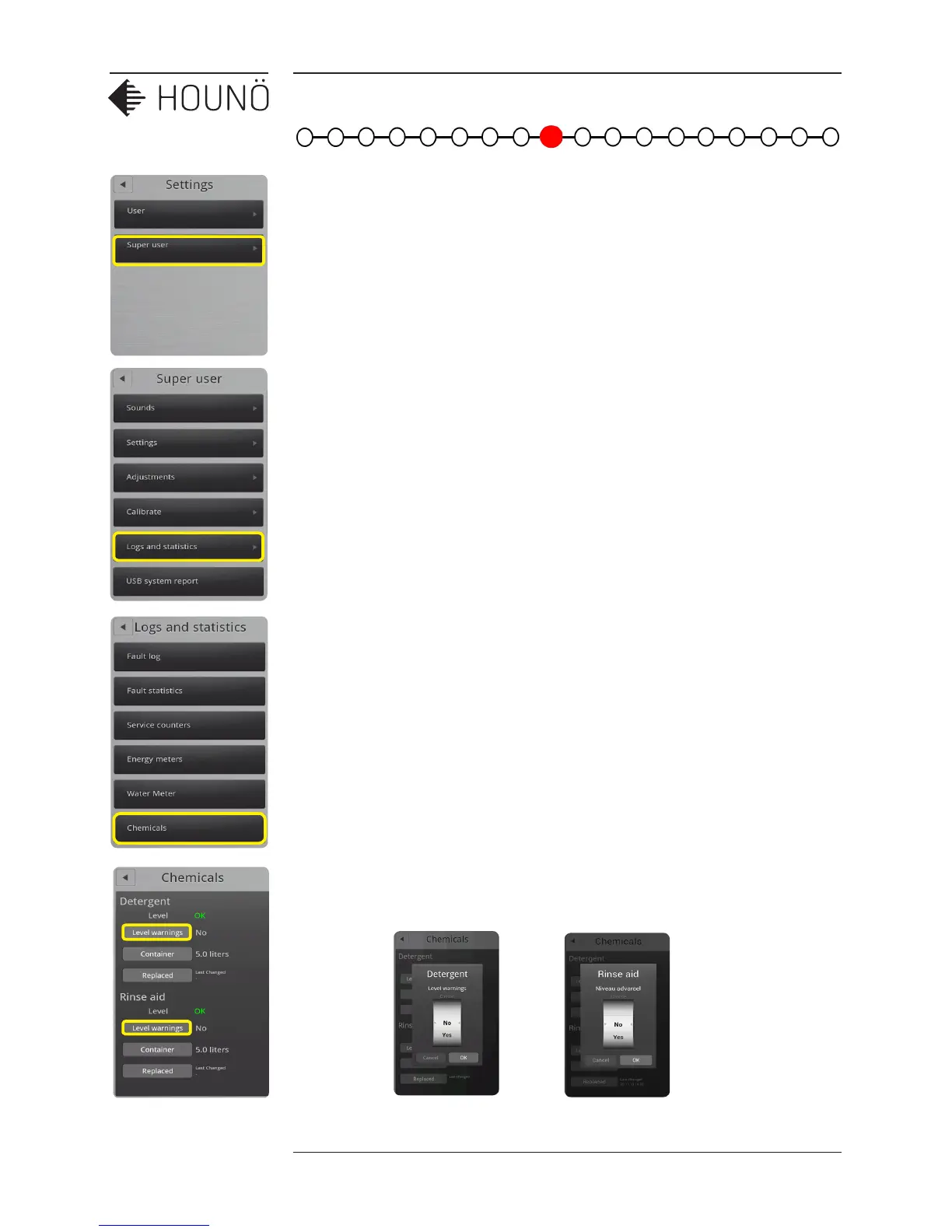 6. Activate the detergent and rinse level warning.