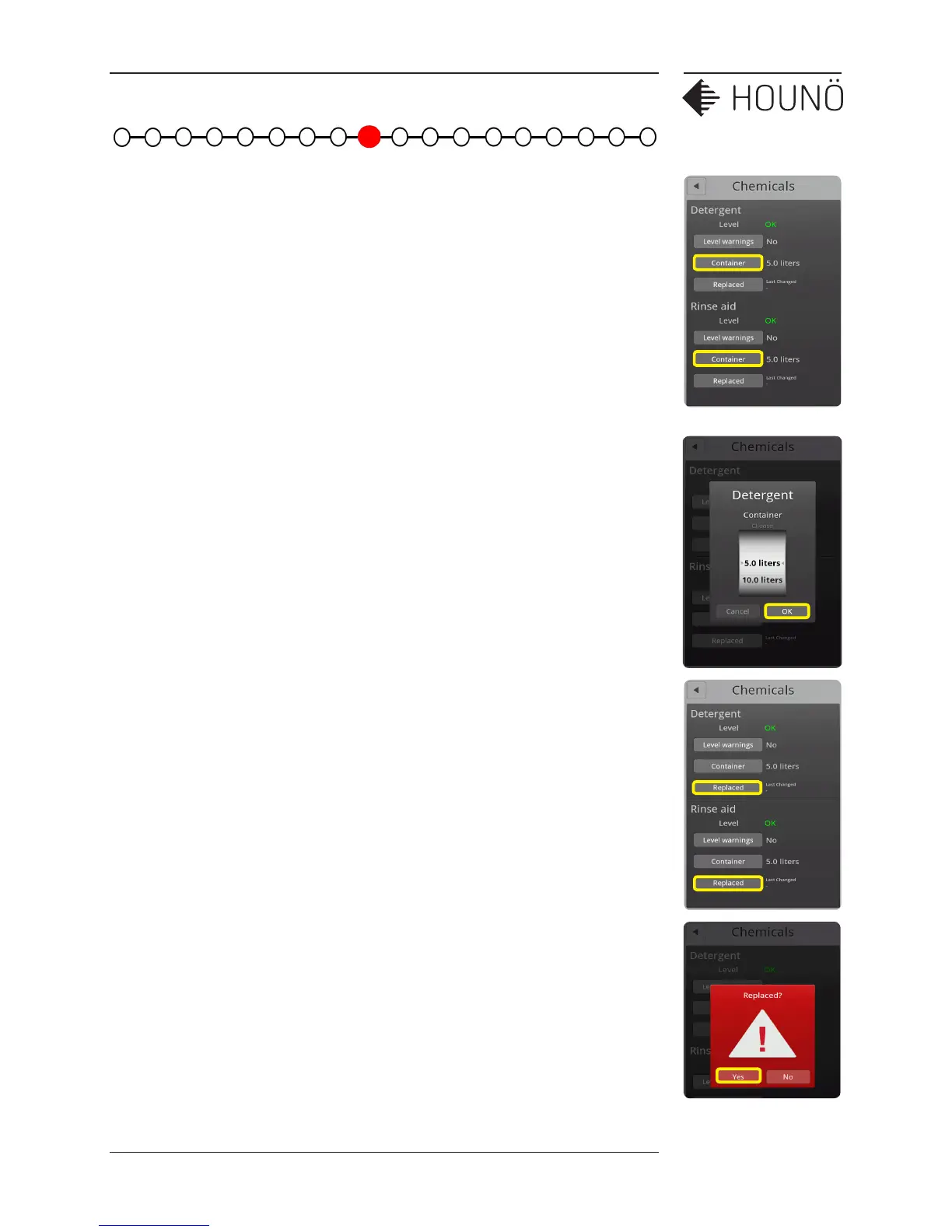 9. Reset the chemical monitor by presing REPLACED and confirming with YES