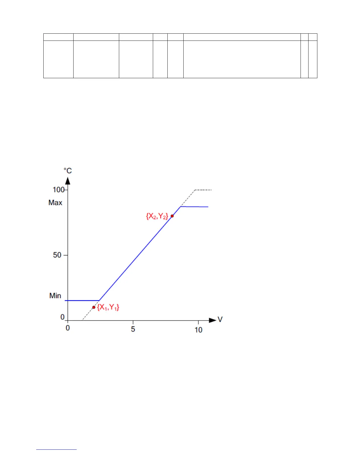 Using a 0-10V signal, a temperature is read in using linear conversion. The characteristic curve is defined by two