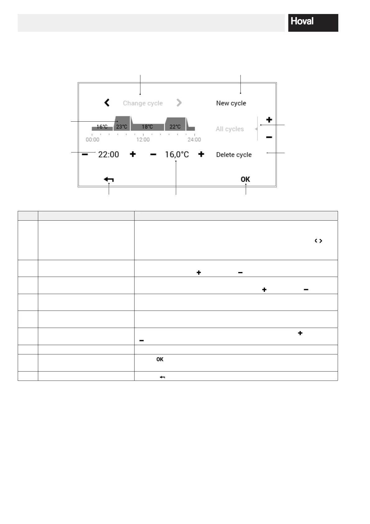 6 All cycles Increase or reduce the temperature of all cycles with plus (
