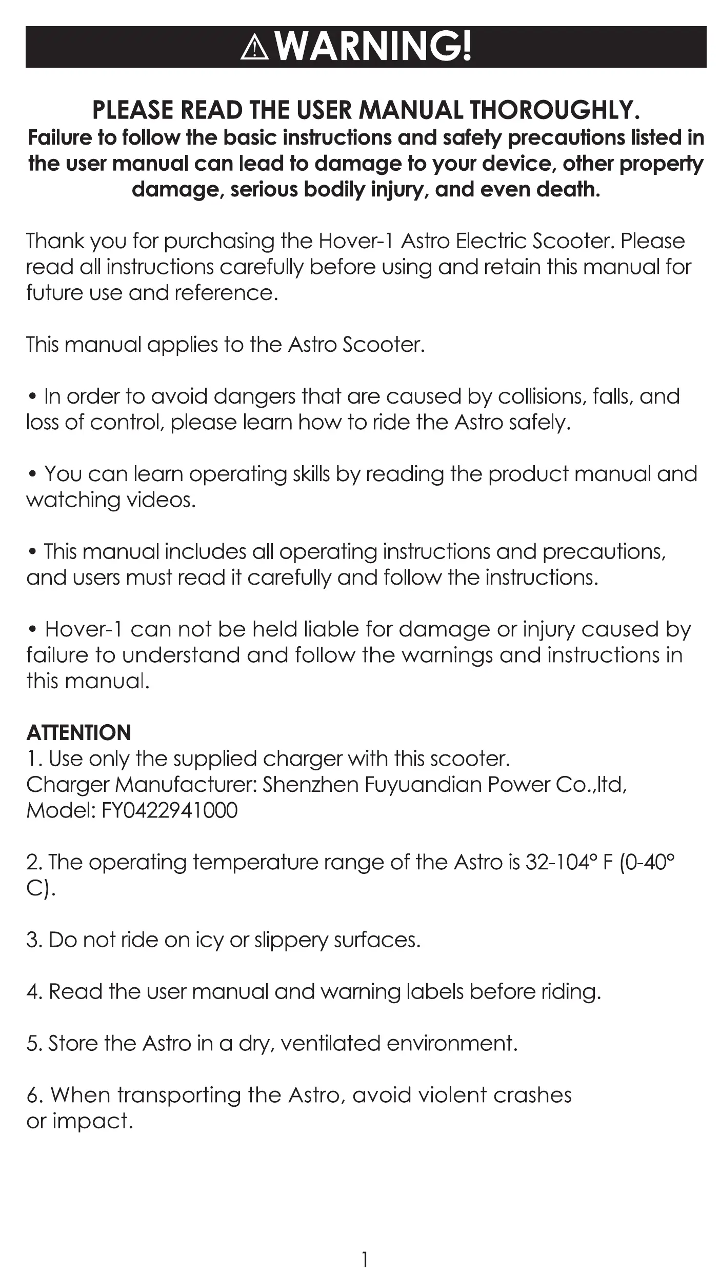 Thank you for purchasing the Hover-I Astro Electric Scooter. Please