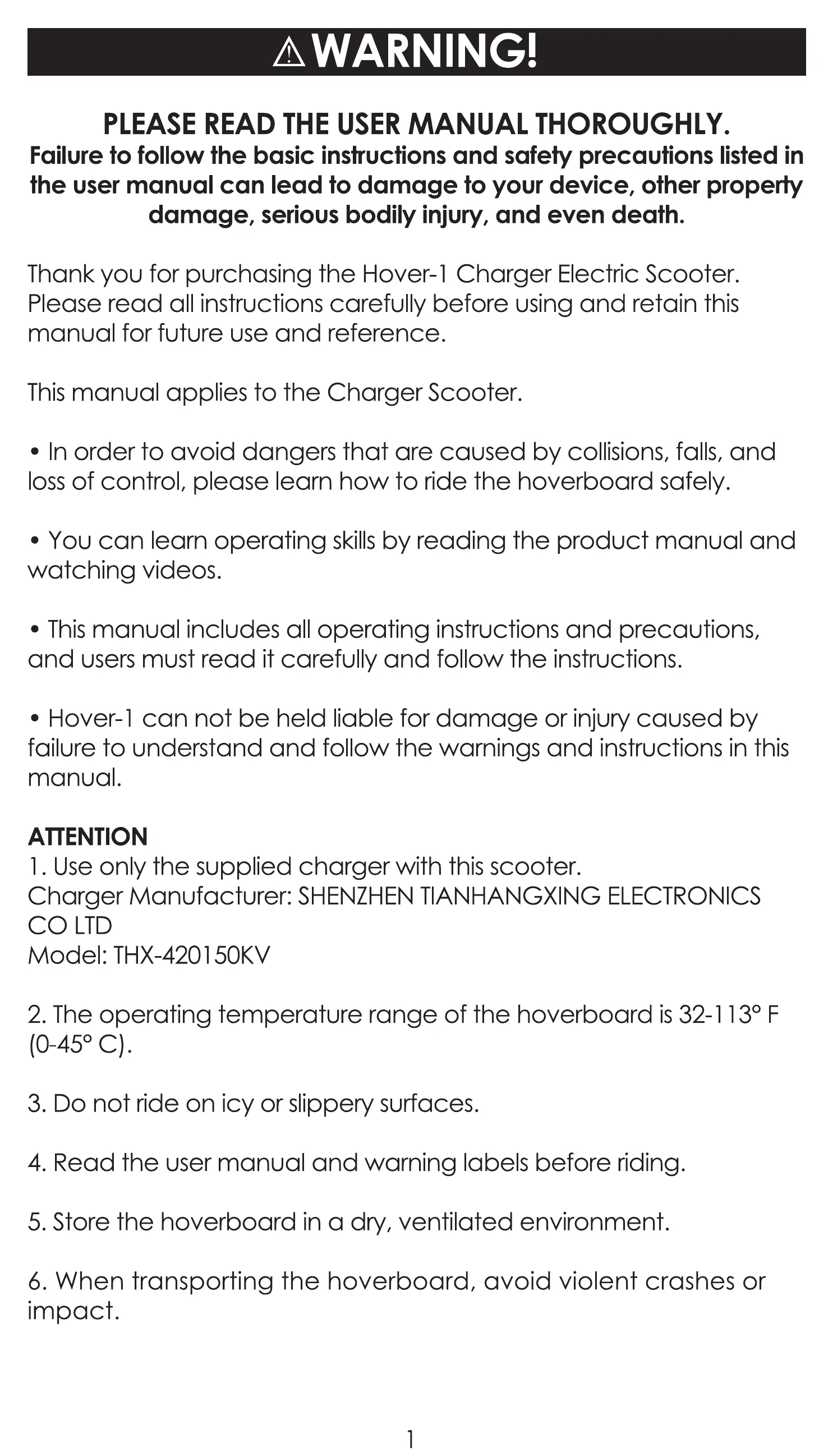 Thank you for purchasing the Hover-I Charger Electric Scooter.