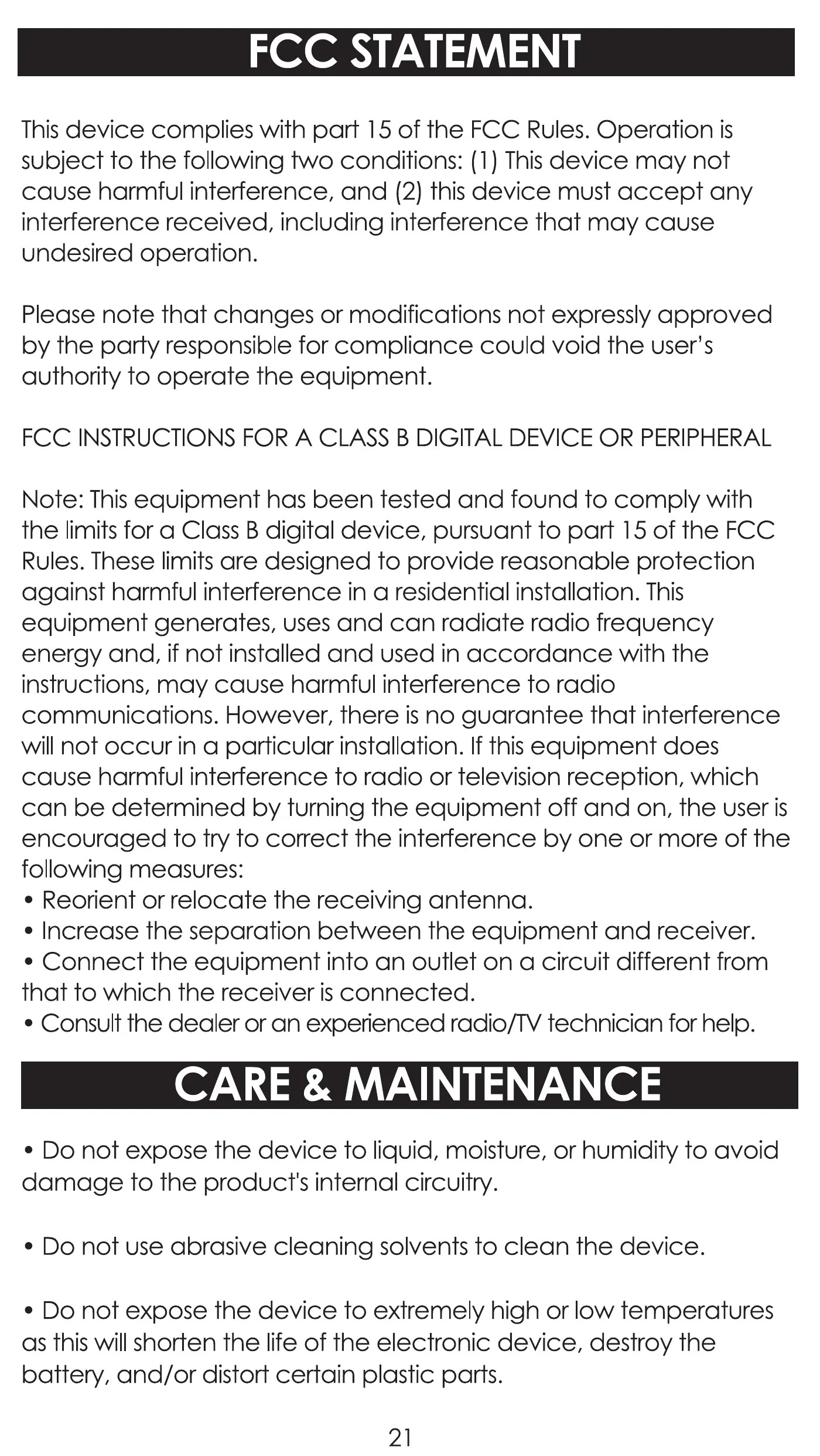 • Do not expose the device to liquid, moisture, or humidity to avoid
