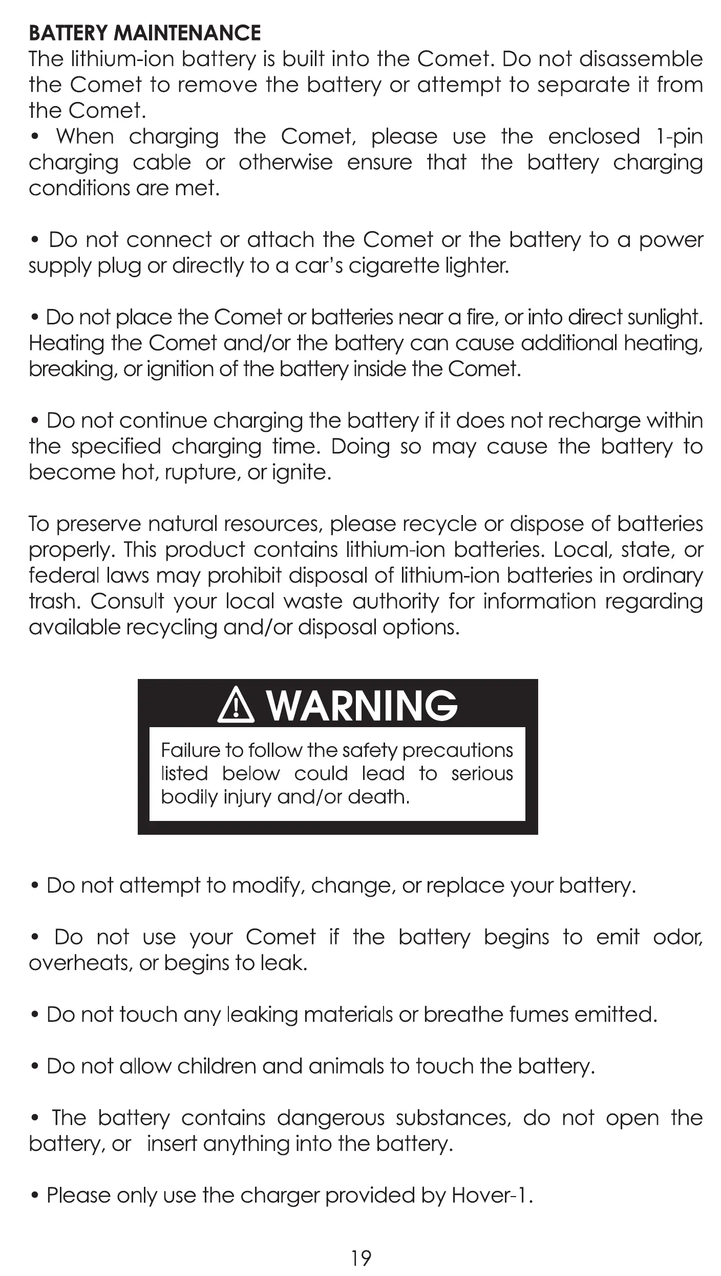 breaking, or ignition of the battery inside the Comet.