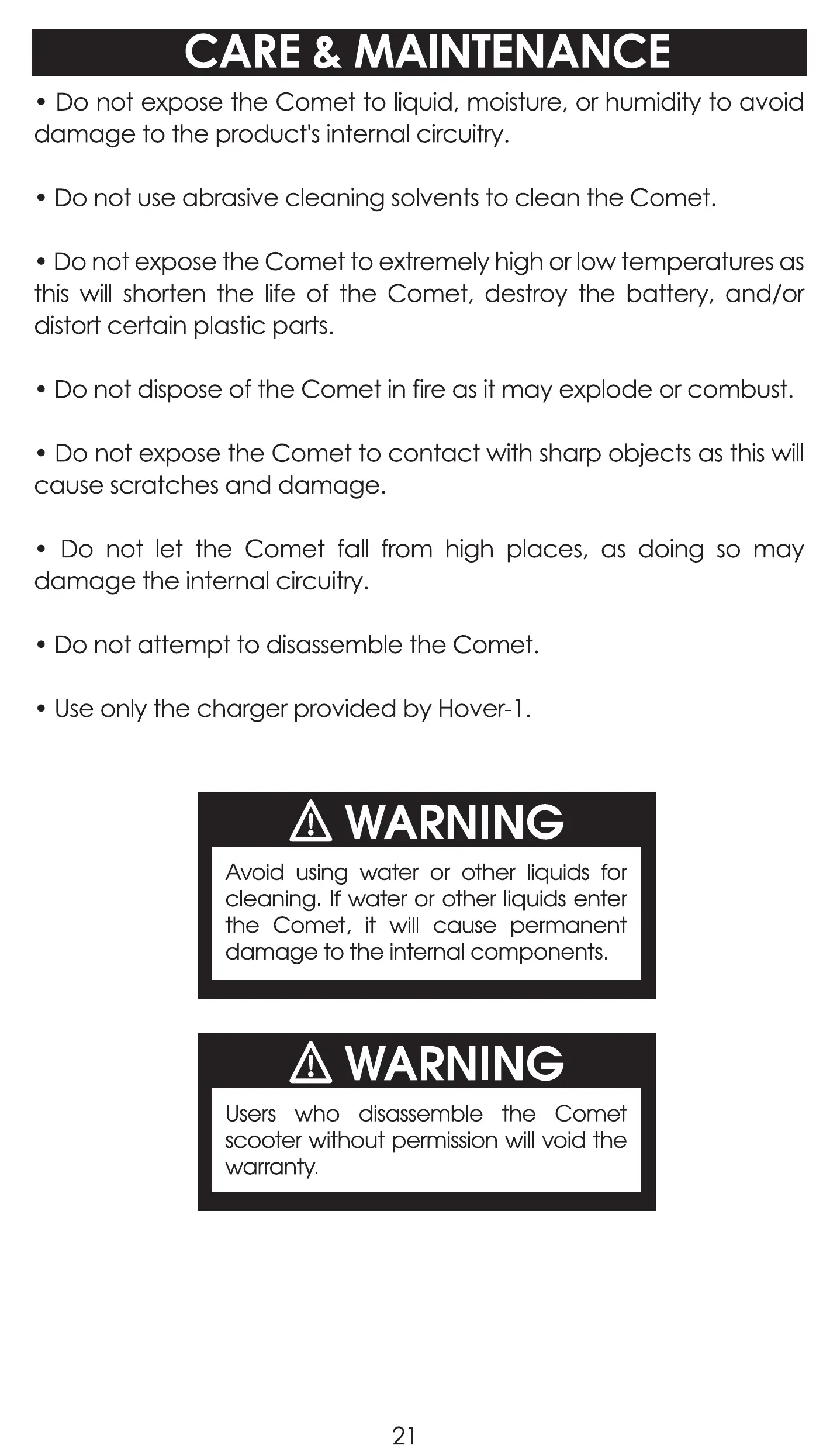 Do not expose the Comet to liquid, moisture, or humidity to avoid