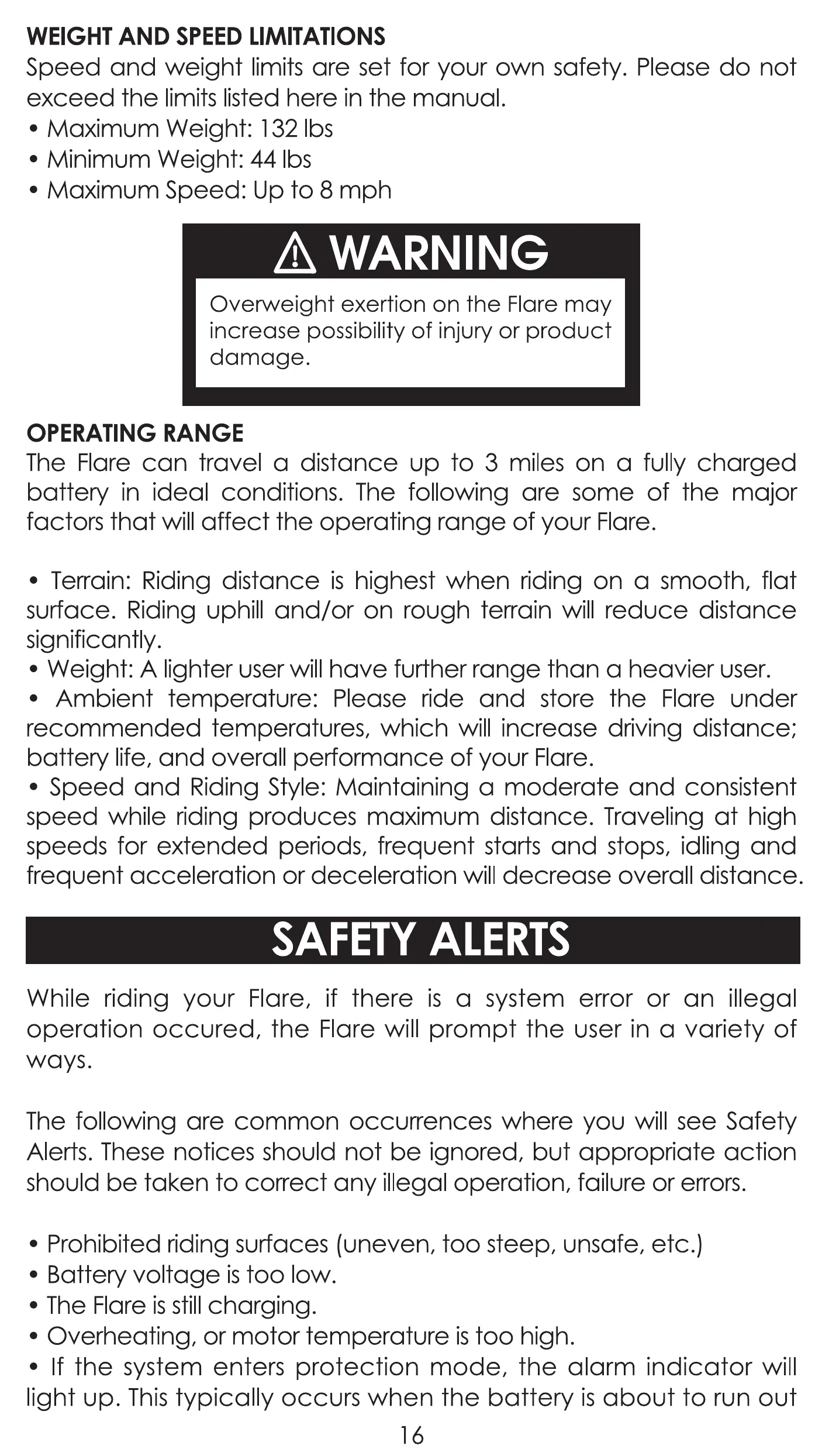 • Ambient temperature: Please ride and store the Flare under