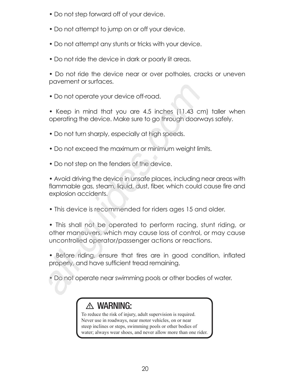 • Do not ride the device in dark or poorly lit areas.
