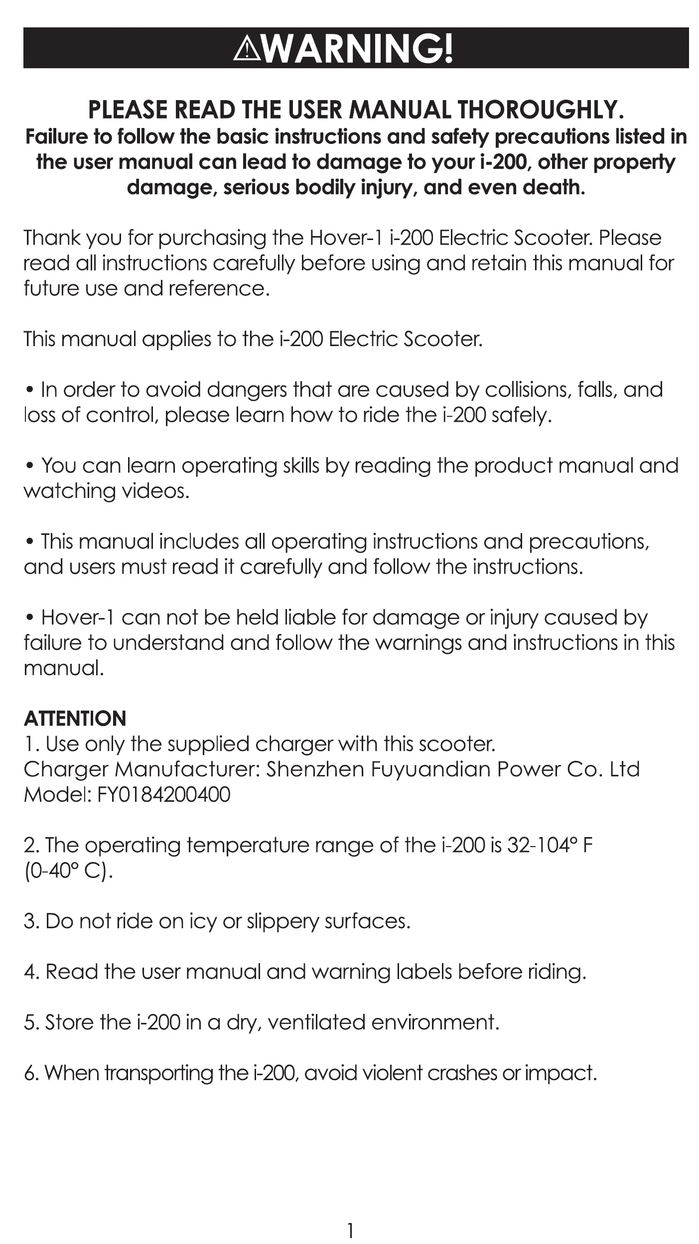 Thank you for purchasing the Hover-I i-200 Electric Scooter. Please