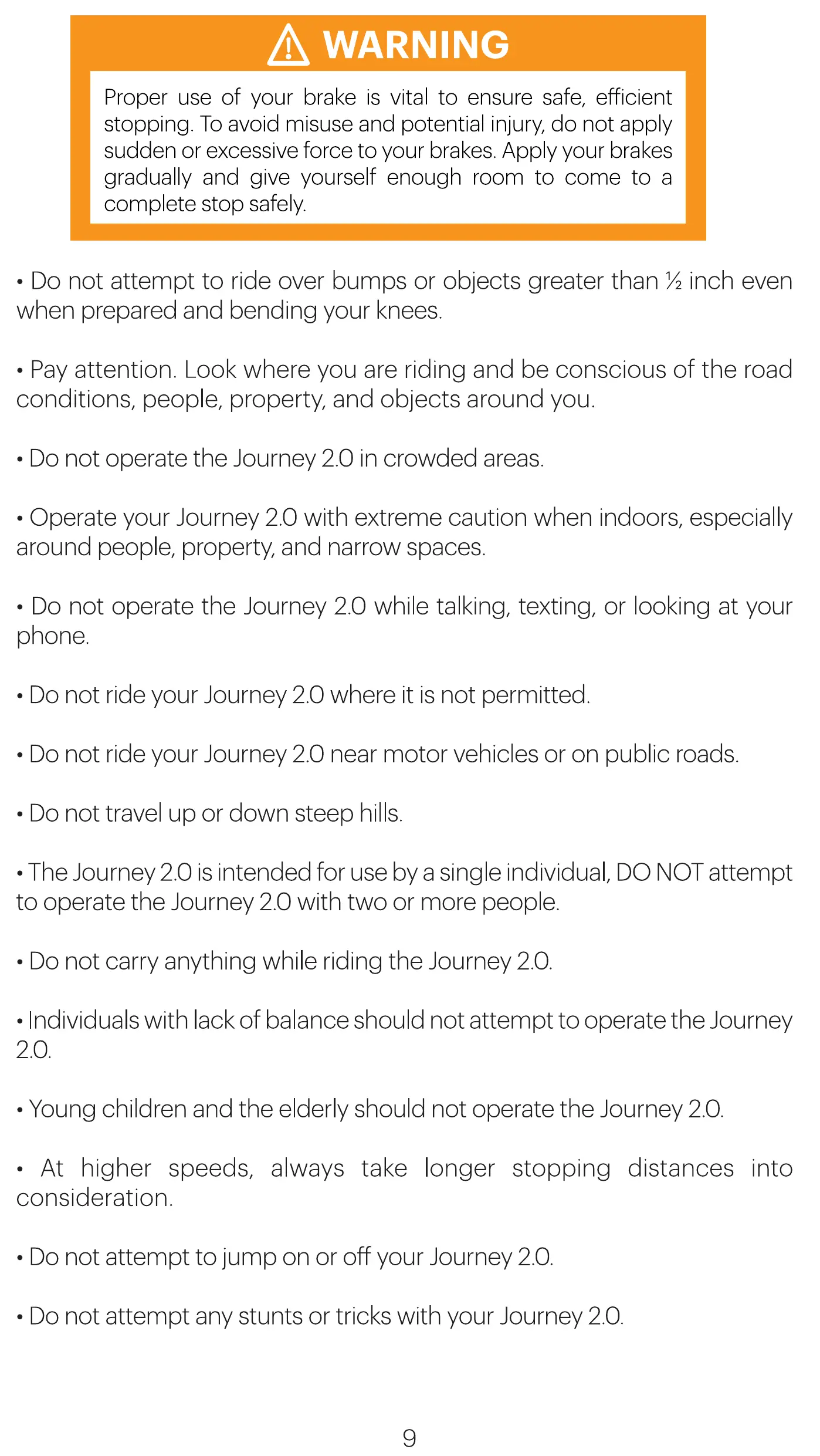 • Do not attempt any stunts or tricks with your Journey 2.0.