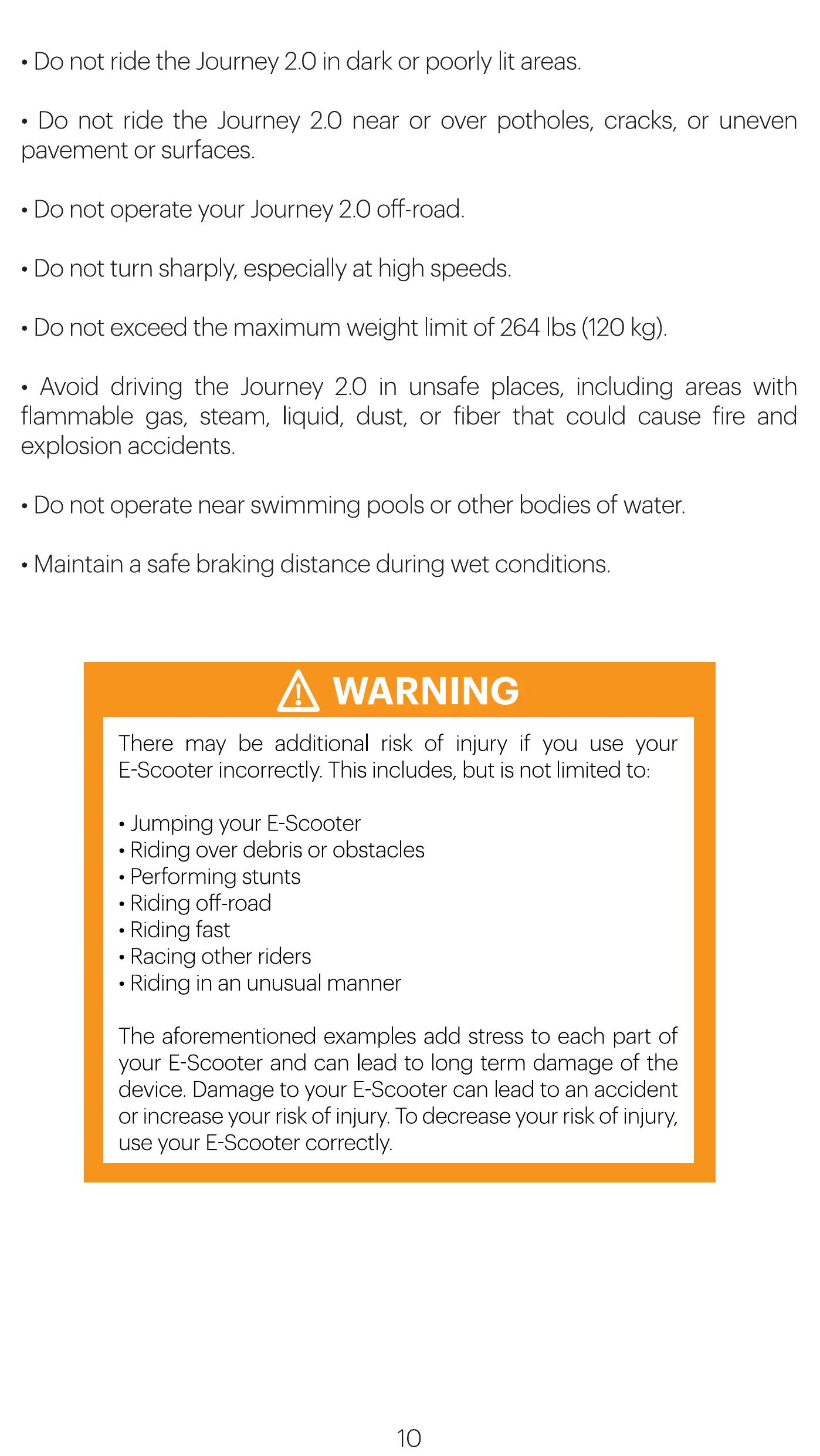 • Do not ride the Journey 2.0 near or over potholes, cracks, or uneven