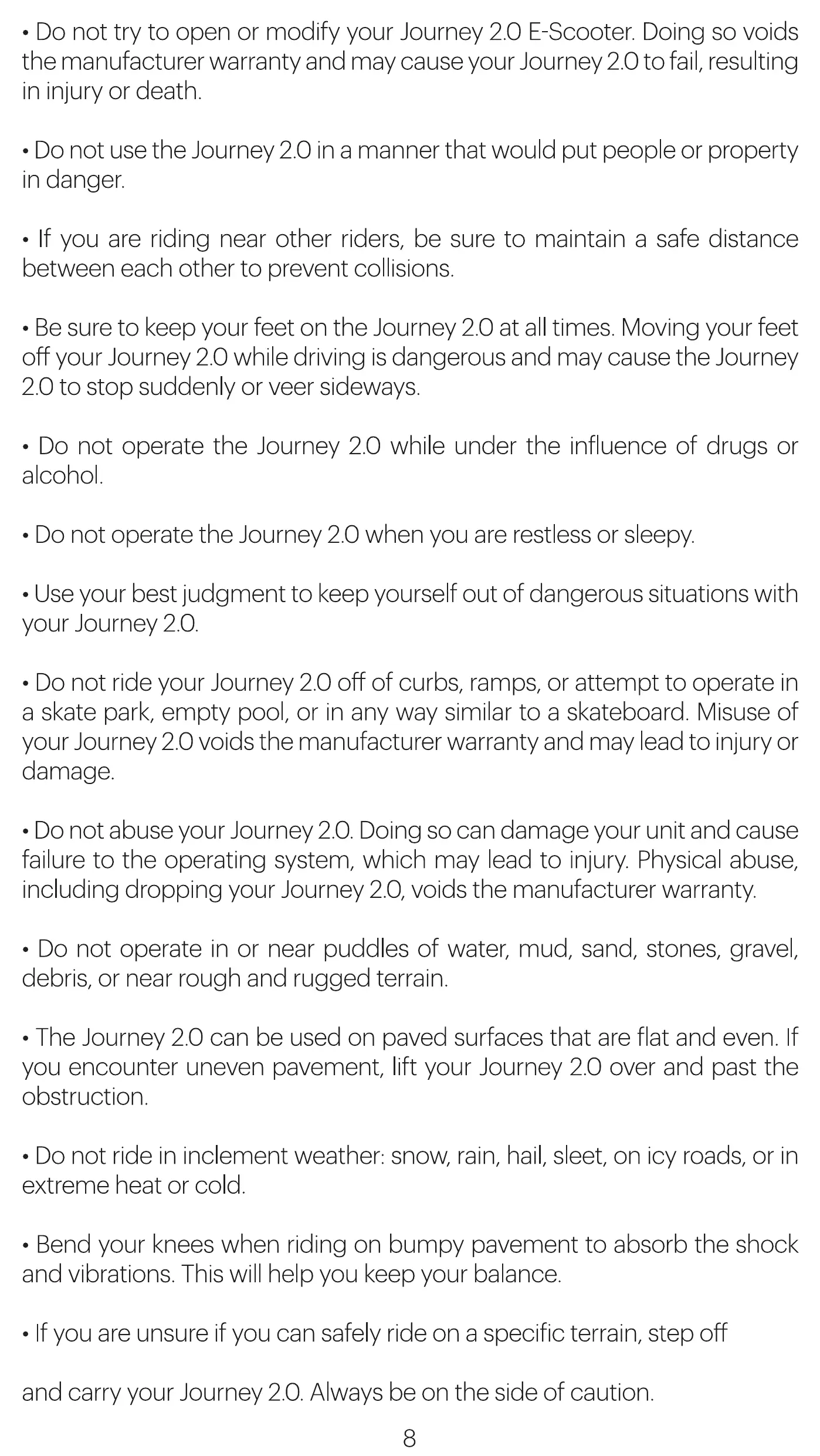 • Do not ride your Journey 2.0 off of curbs, ramps, or attempt to operate in