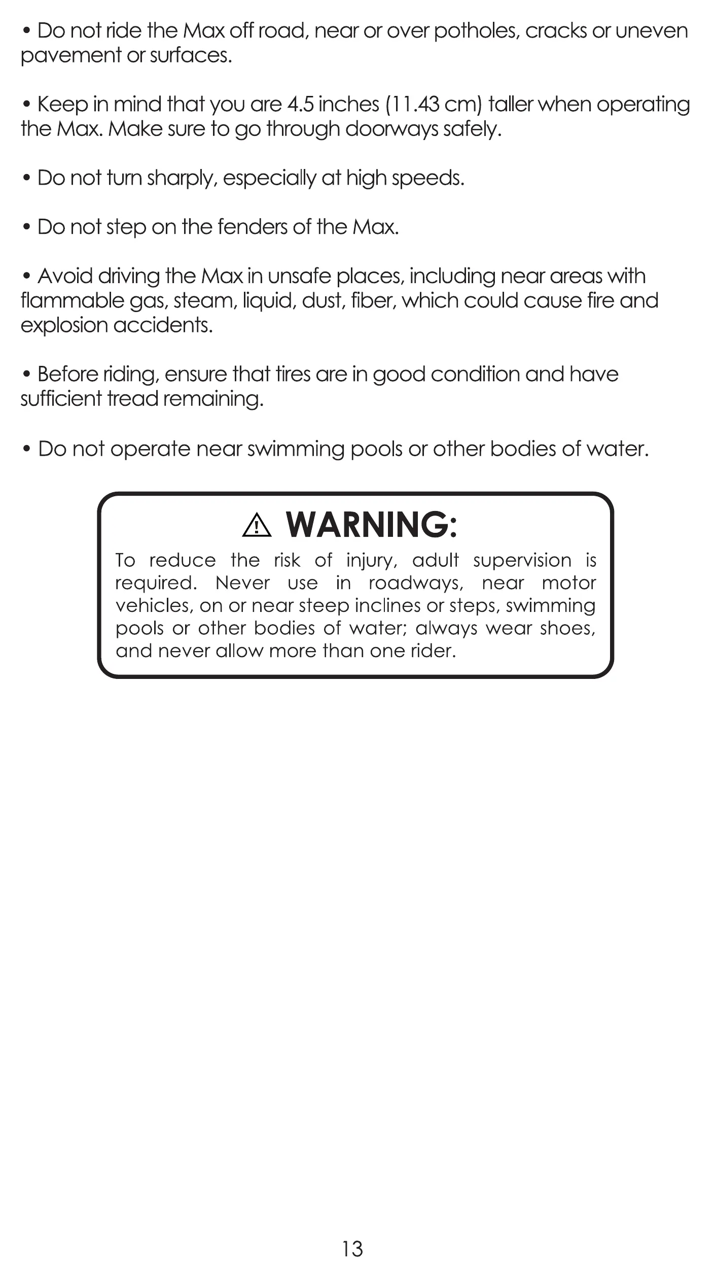 • Do not ride the Max off road, near or over potholes, cracks or uneven