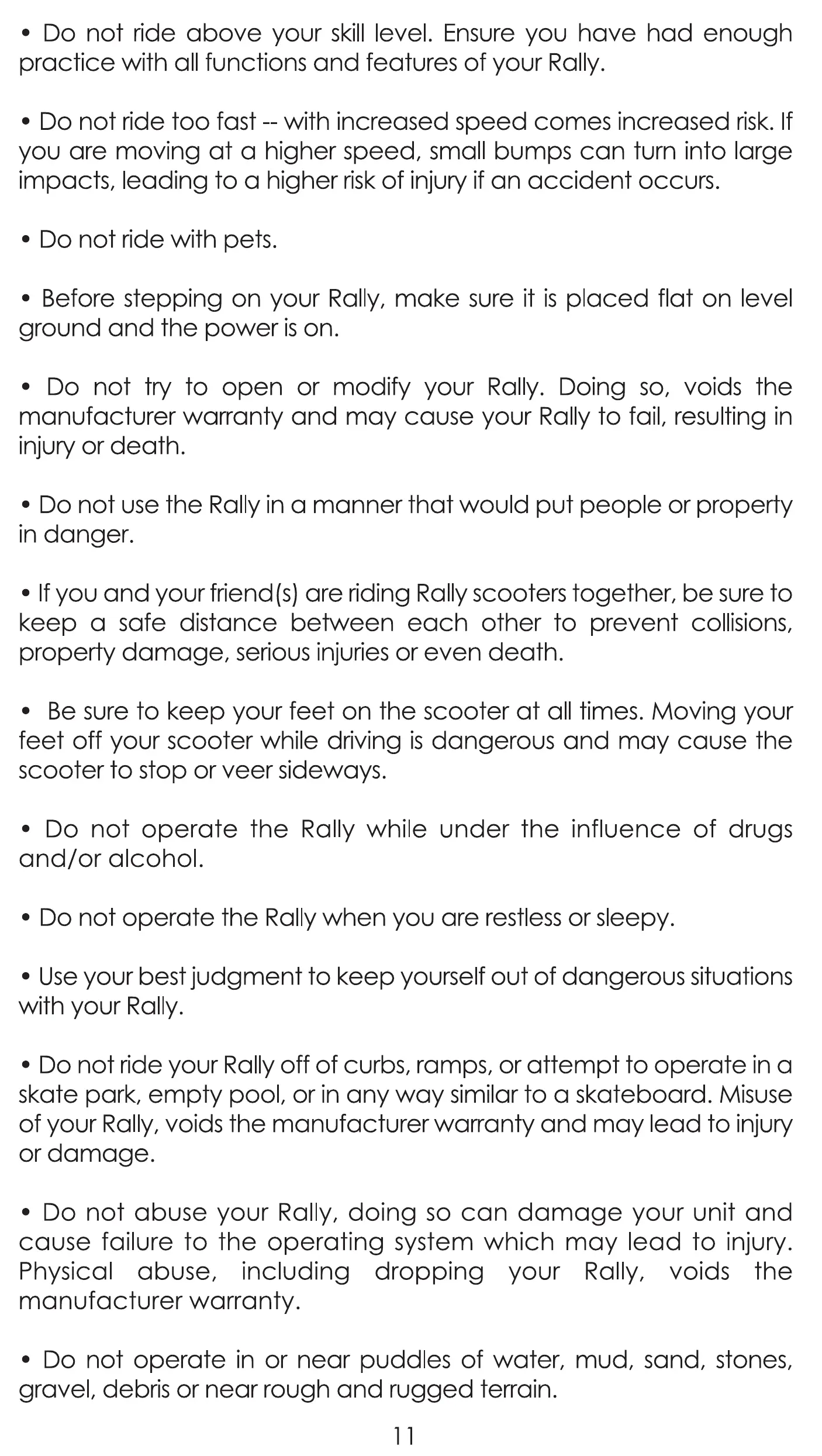 Do not ride your Rally off of curbs, ramps, or attempt to operate in a
