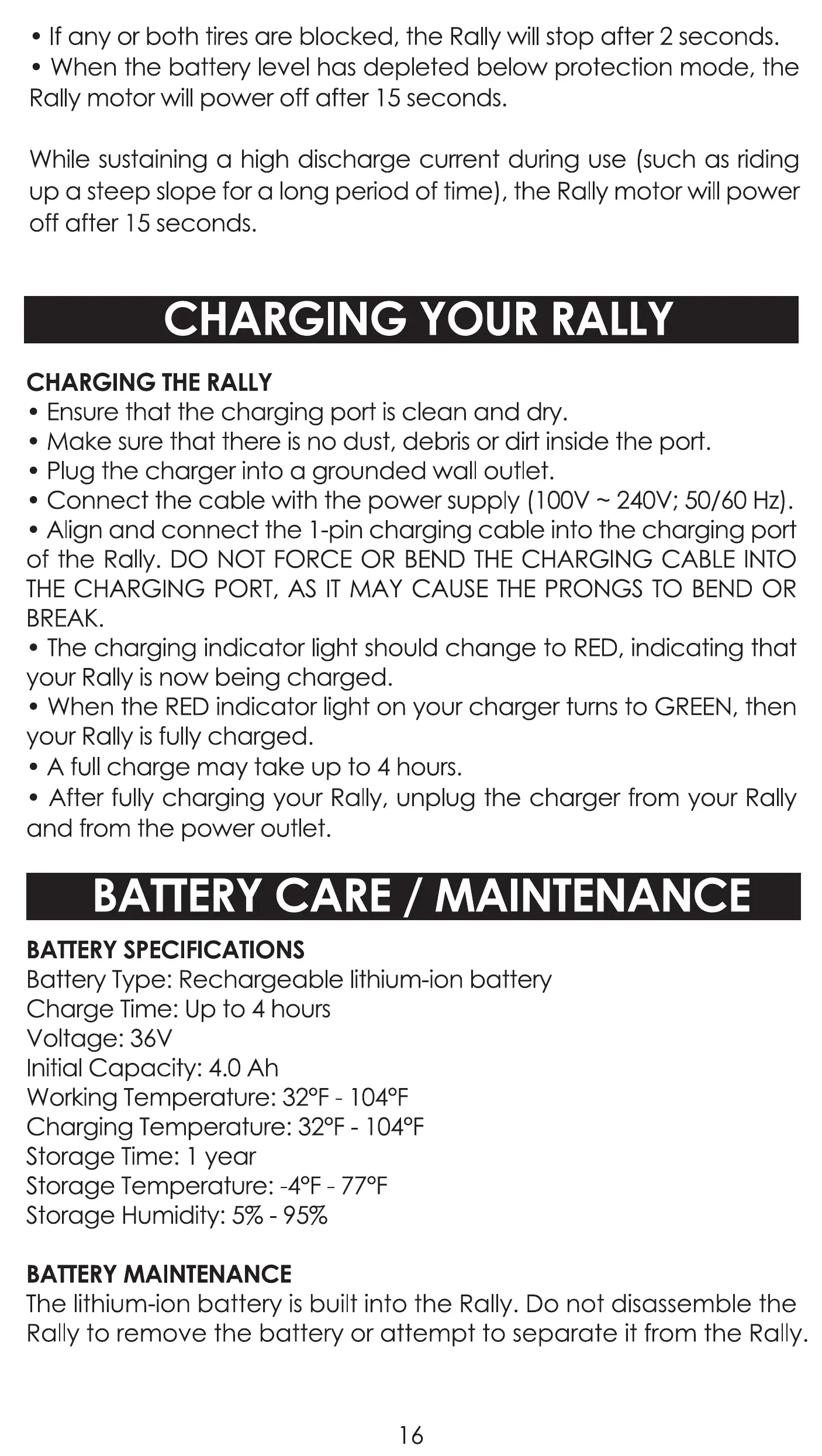 of the Rally. DO NOT FORCE OR BEND THE CHARGING CABLE INTO