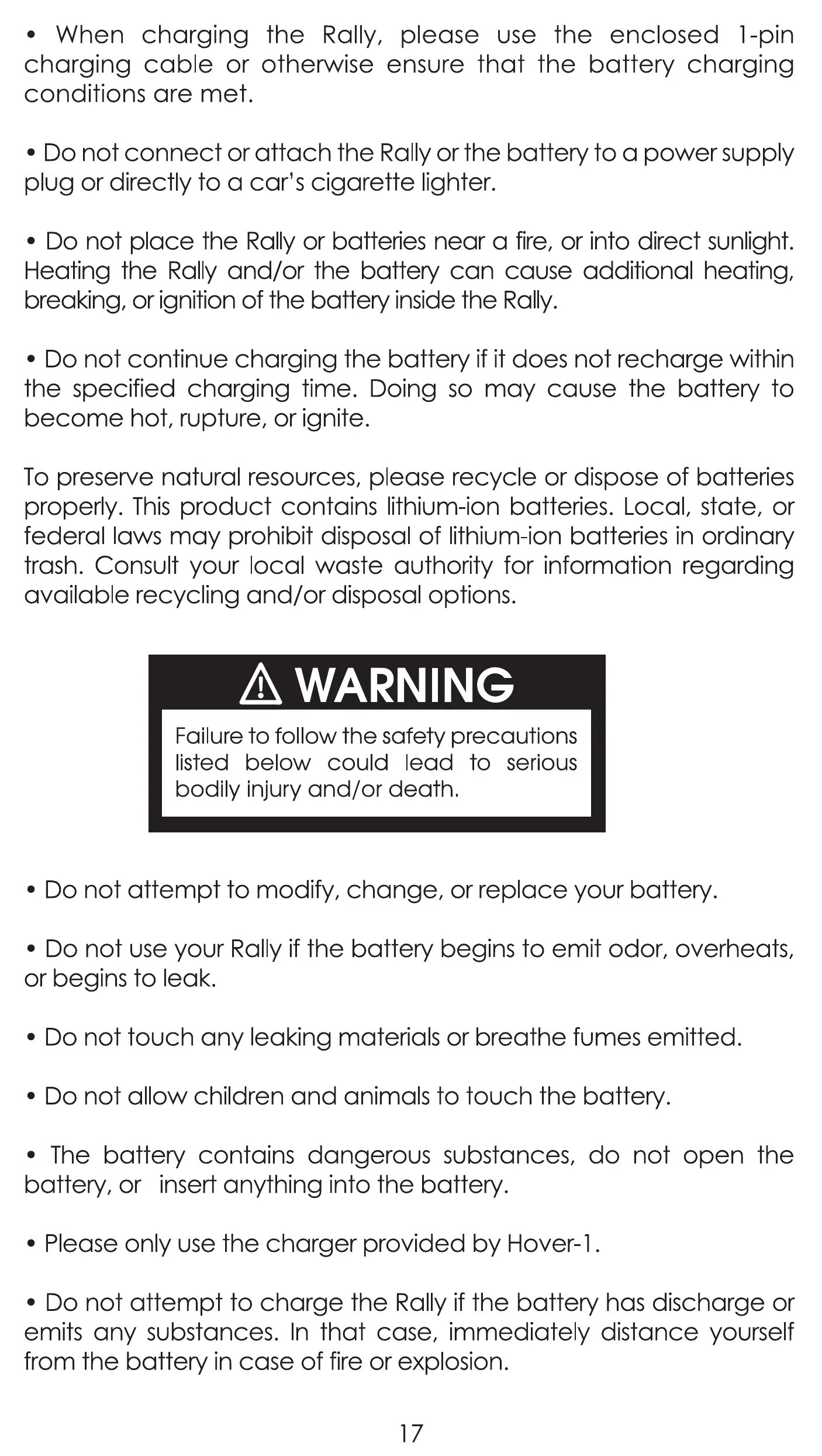 breaking, or ignition of the battery inside the Rally.