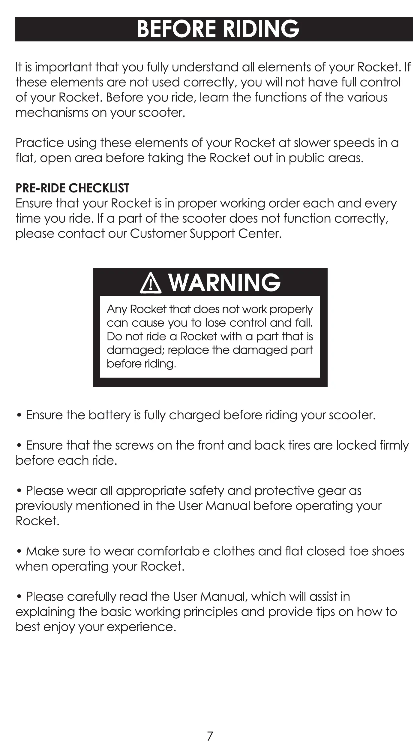 • Ensure the battery is fully charged before riding your scooter.