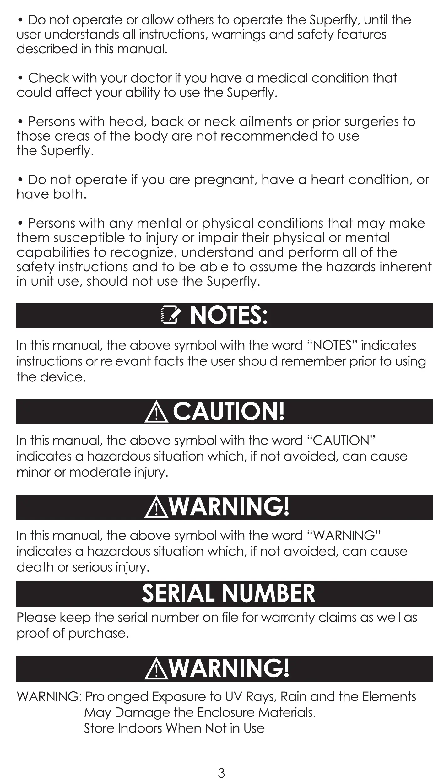 • Do not operate or allow others to operate the Superfly, until the