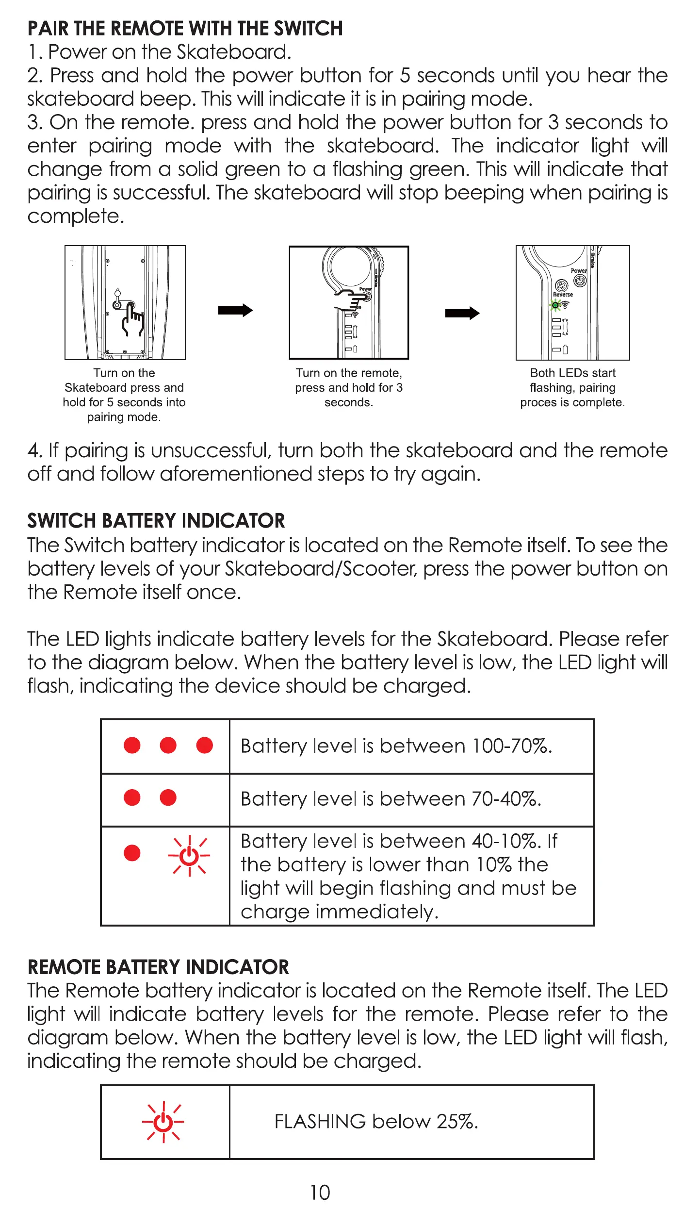 The LED lights indicate battery levels for the Skateboard. Please refer