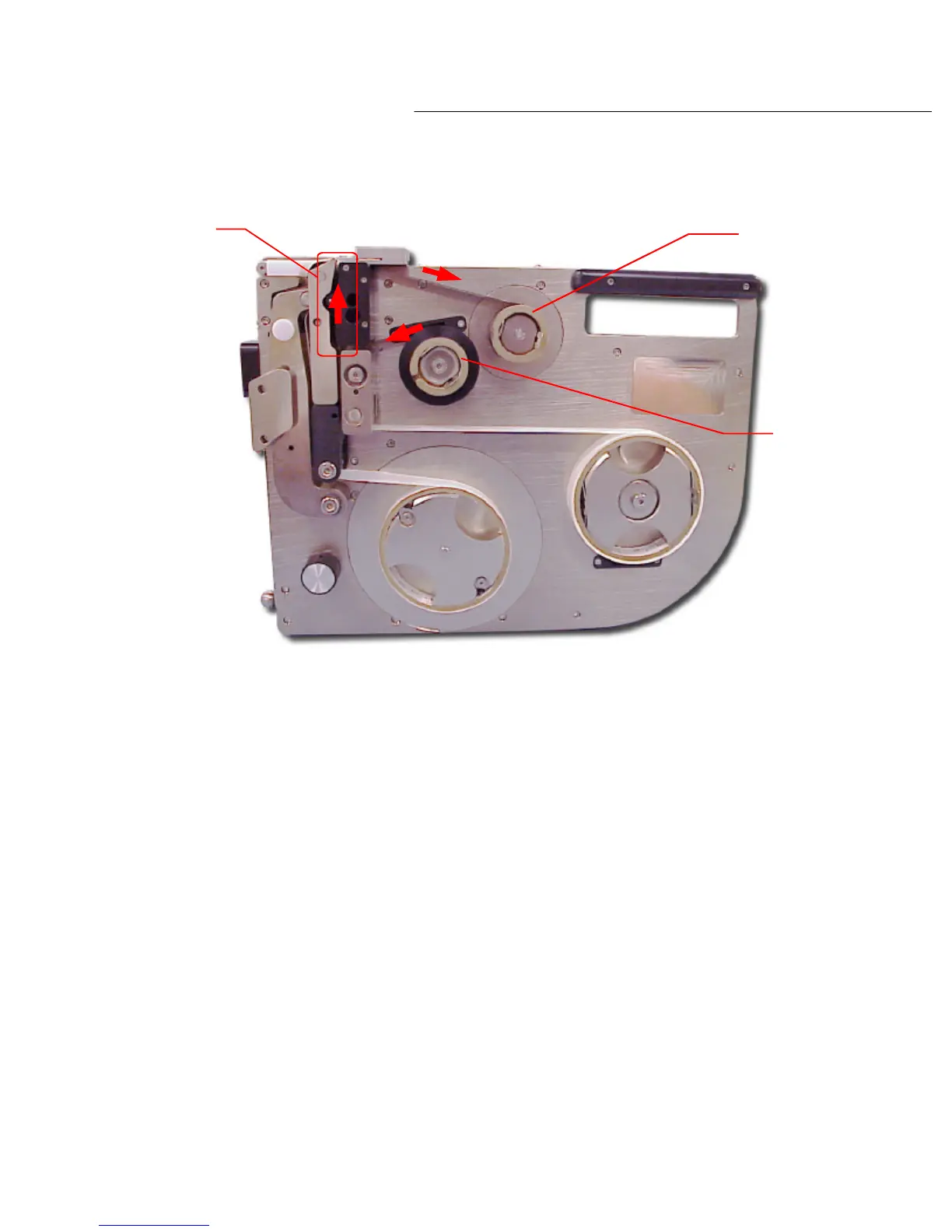 Next, feed the tape up and over the ‘print head cover’ and onto the ‘take up’ mandrels shown in
