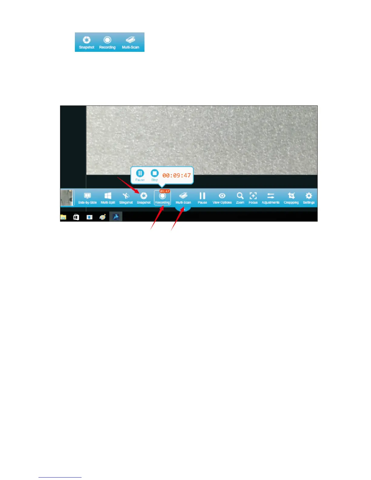 Click to take a snapshot, start recording, or take consecutive pictures.