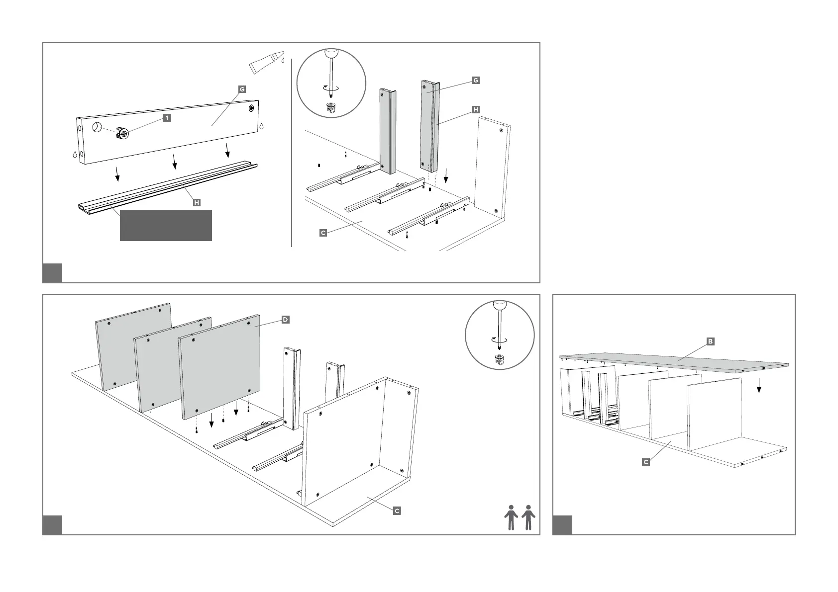 2 - Attach drawer inll panels onto the side panel (C) and tighten