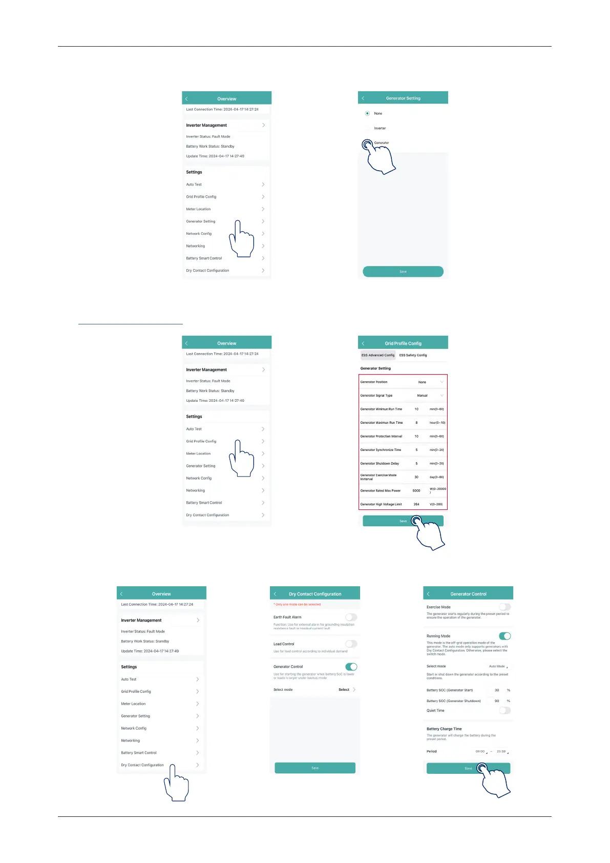 your finger up to set generator parameters, and tap “Save”. For detailed parameters, please refer to