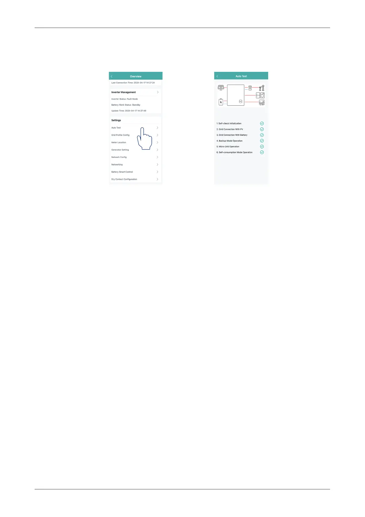connected, and all AC and DC switches are turned on, and then tap “Auto Test”. If there is any problem,