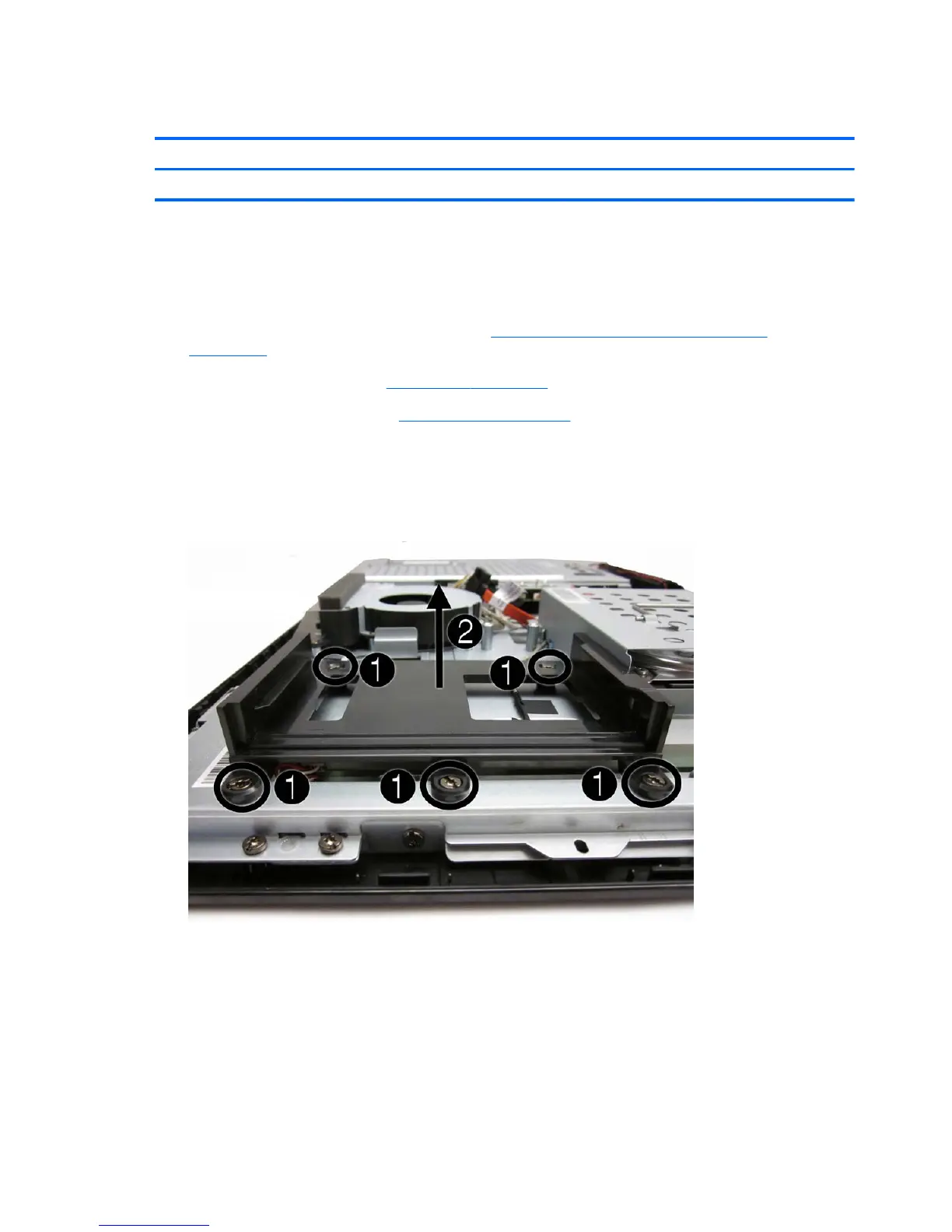4. Remove the five Torx T15M3.0x6.0 screws (1) that secure the optical drive bracket to the