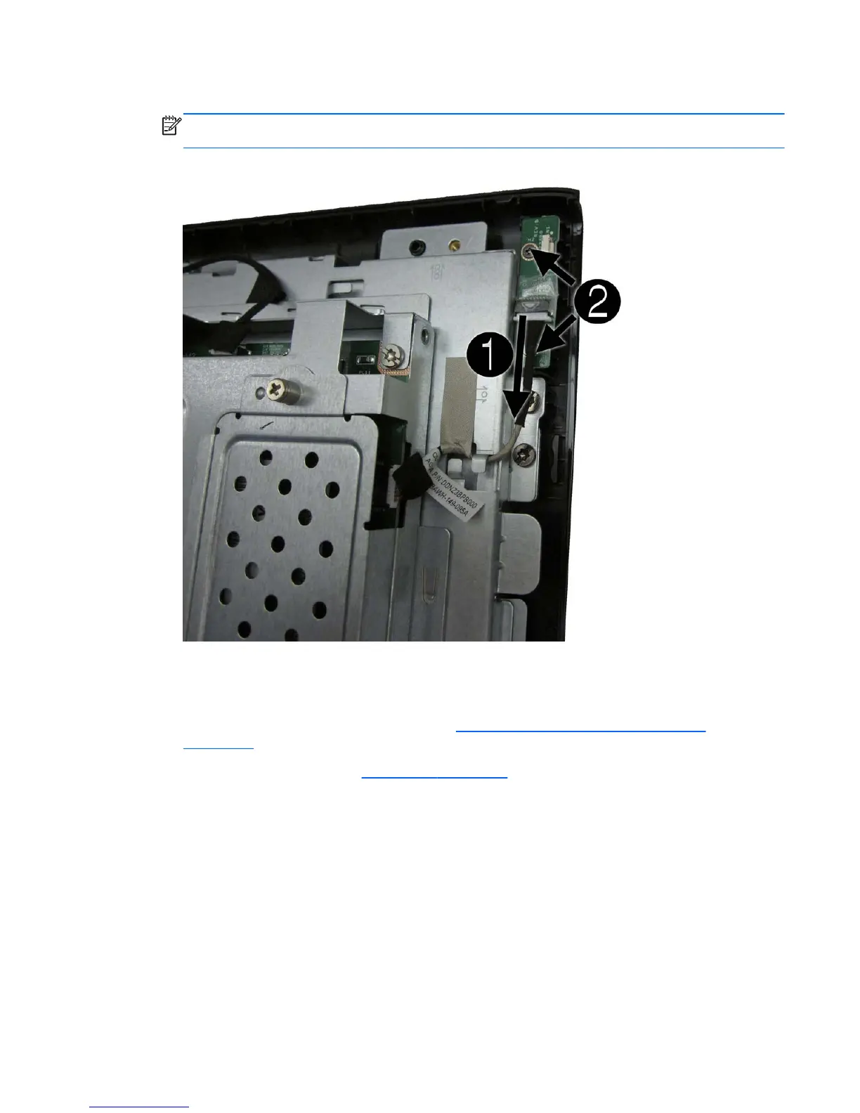 3. Disconnect the cable from the power button board (1) and the system board (2).