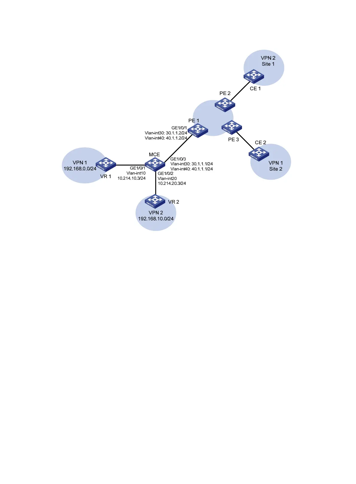 1. Create VPN instances on the MCE and PE 1, and bind the VPN instances with VLAN interfaces in