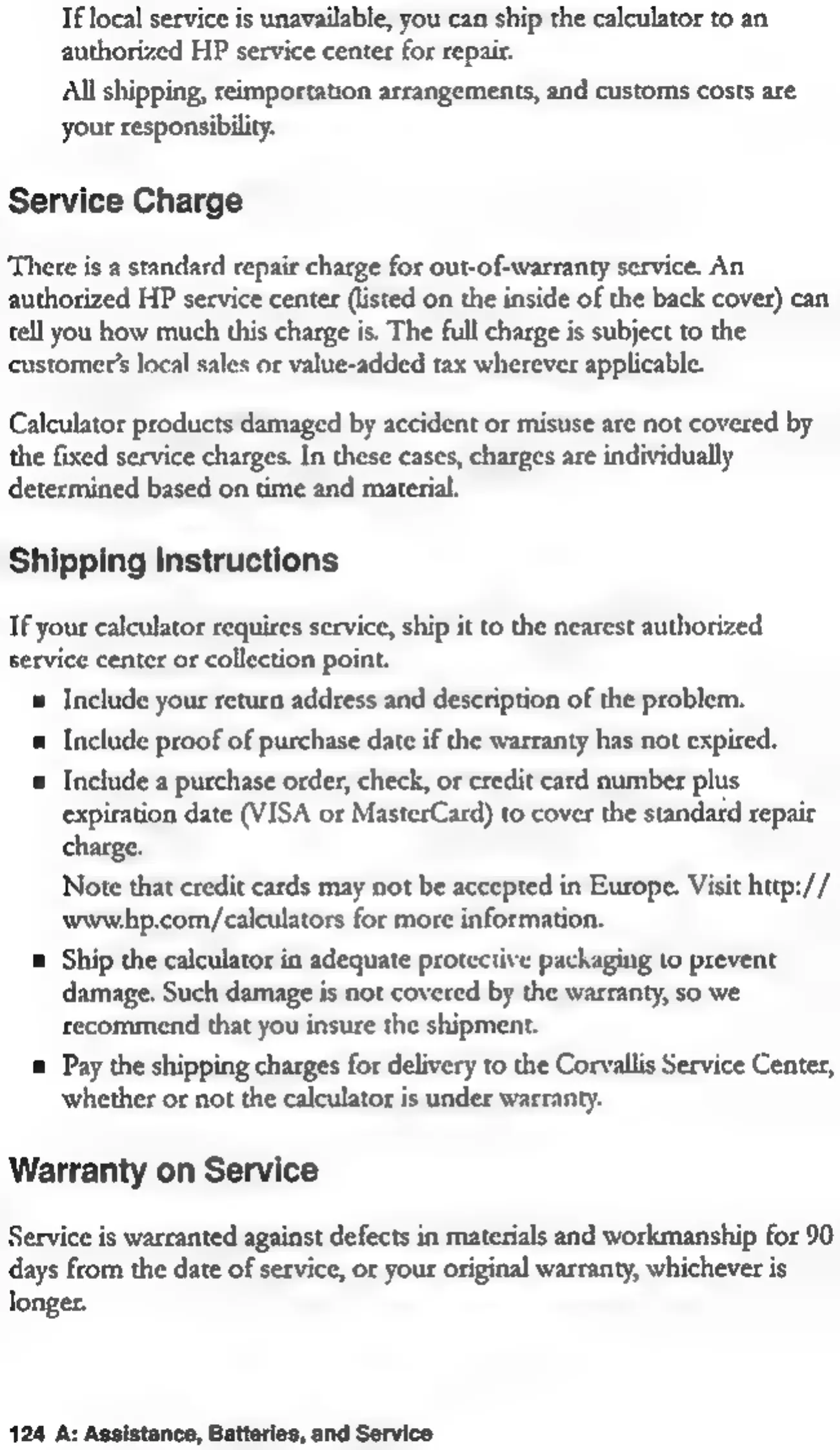 HP 10bII - Service Charge; Shipping Instructions; Warranty on Service
