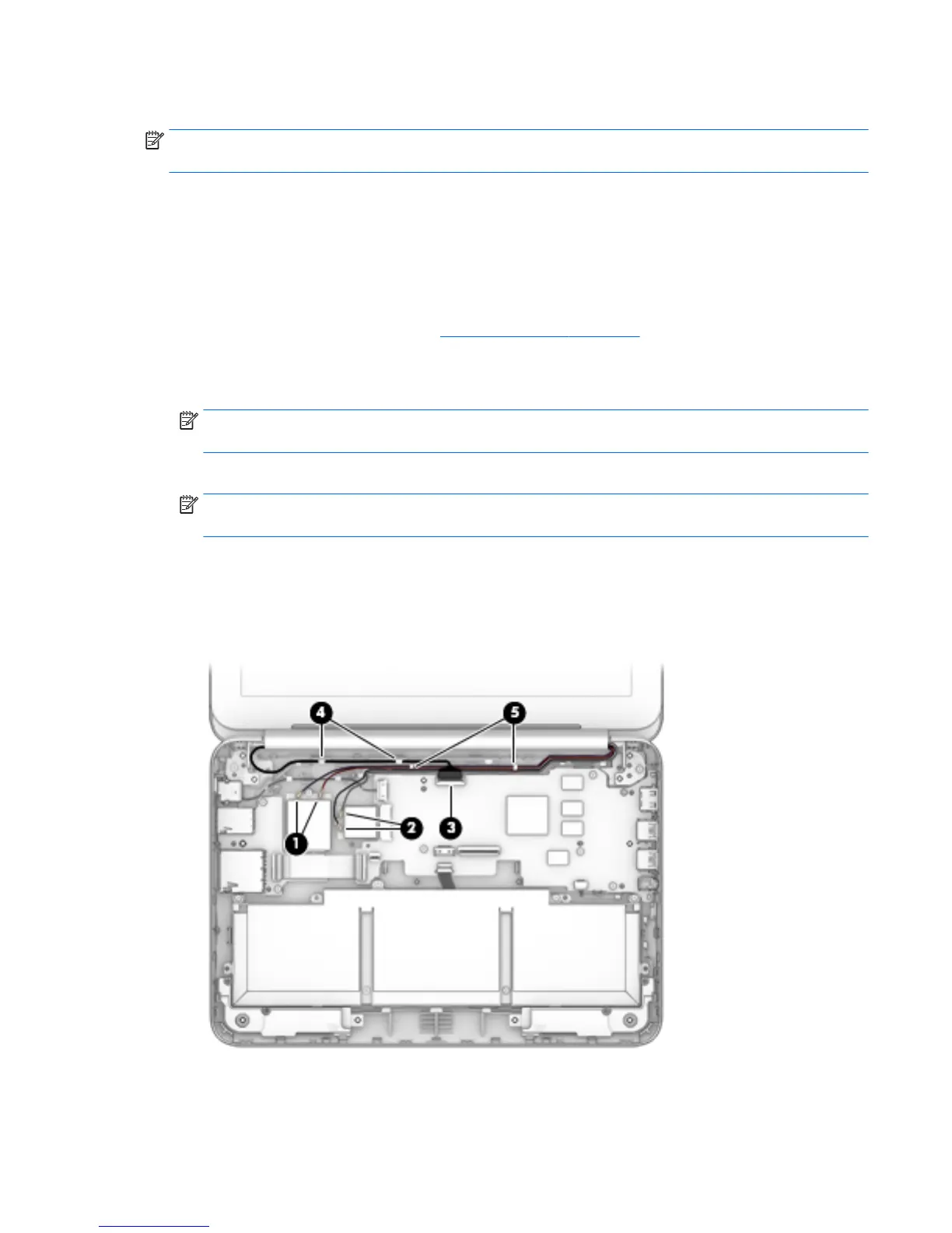 5. Release the WLAN antenna cables from the routing clips (5) and channel built into the base enclosure.