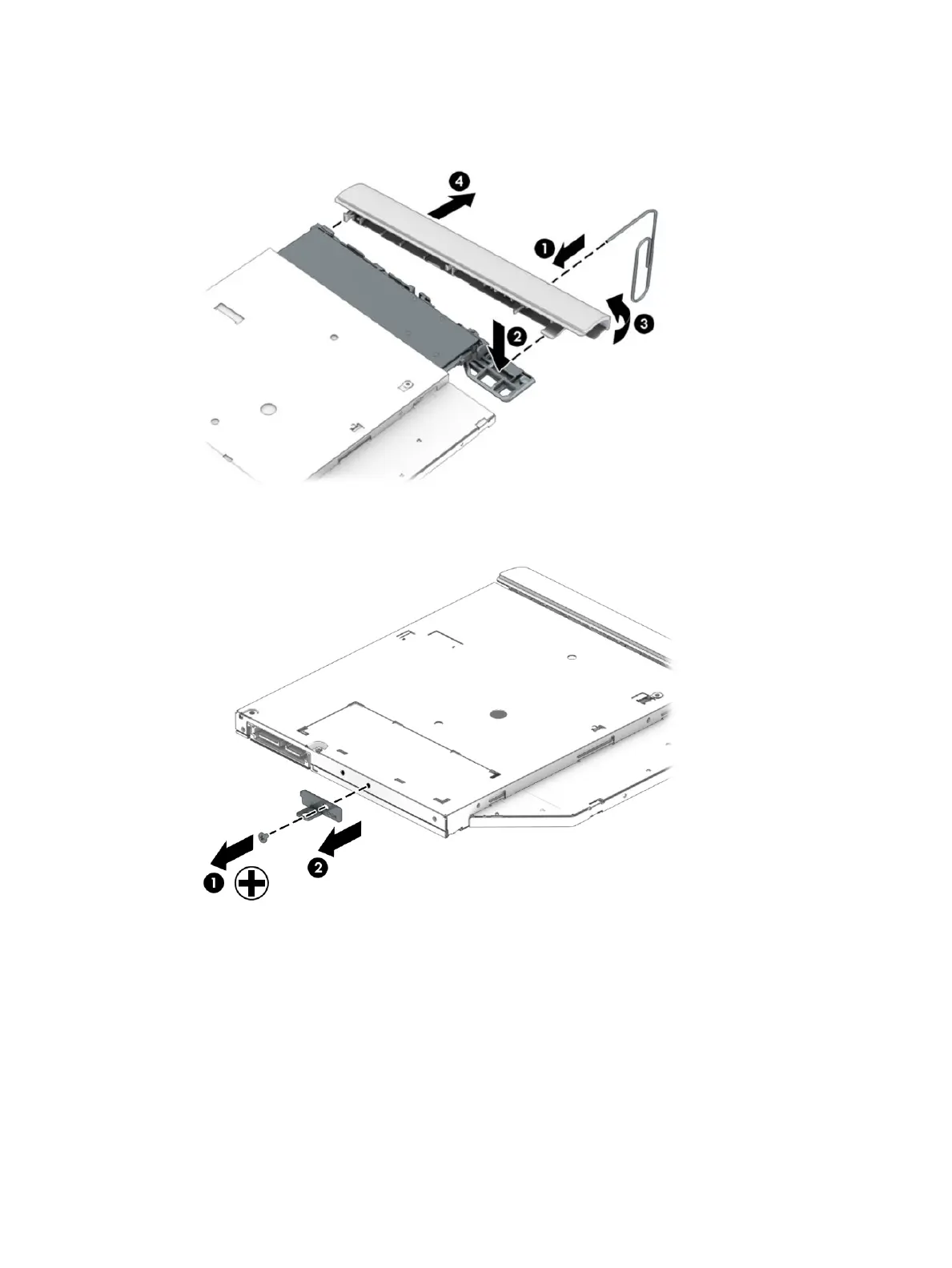 disengage the bezel. Press the tab (2) to release the bezel from the drive. Rotate the side of the bezel
