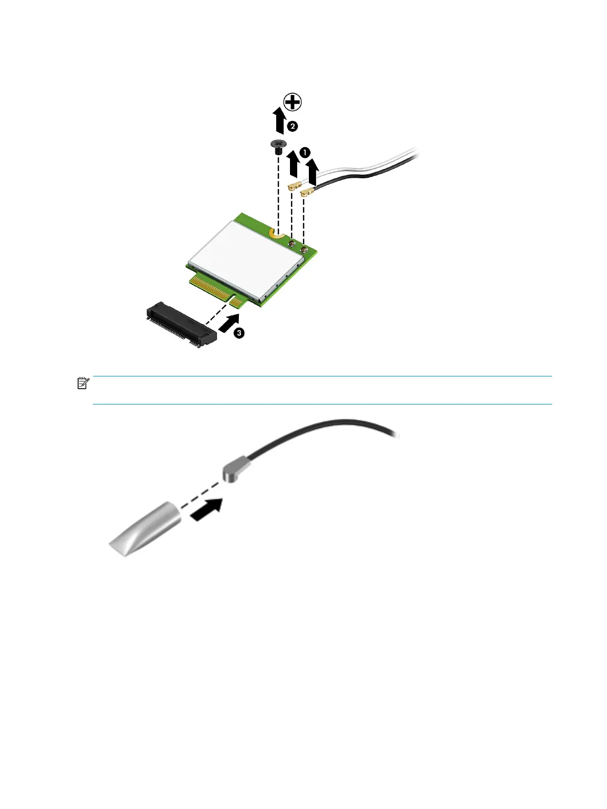 3. Remove the WLAN module by pulling the module away from the slot at an angle (3).