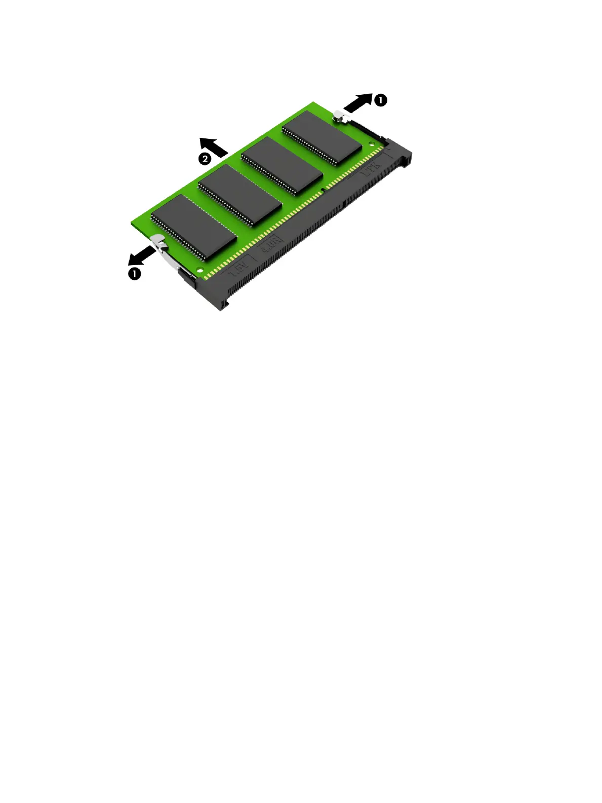2. Remove the memory module (2) by pulling it away from the slot at an angle.