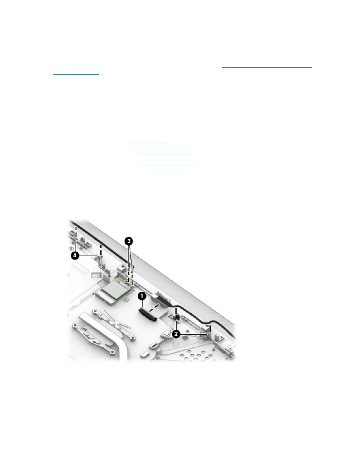 2. Remove the antenna cables from the WLAN module (3), and then remove the cables from their routing