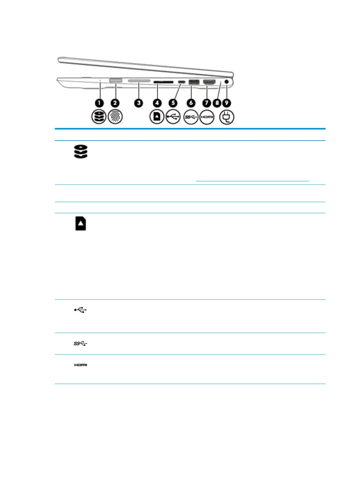 (6) USB SuperSpeed port Connects a USB device, such as a cell phone, camera, activity