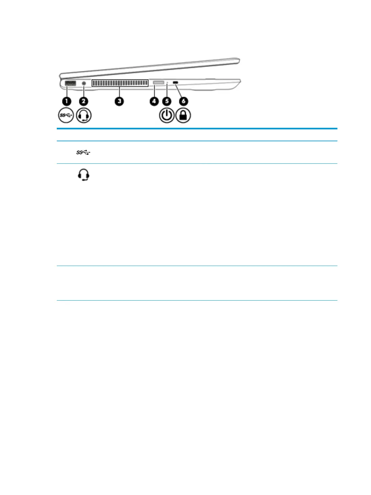 (1) USB SuperSpeed port Connects a USB device, such as a cell phone, camera, activity