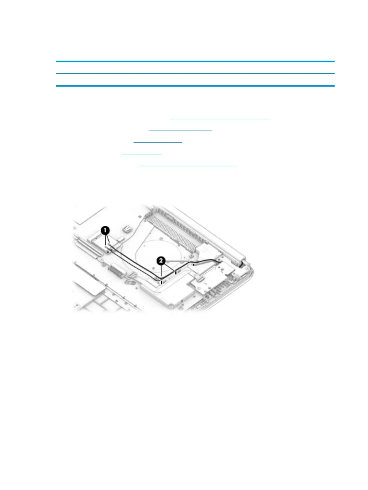 1. Disconnect the antennas from the WLAN module (1), and the remove the antenna cables from the
