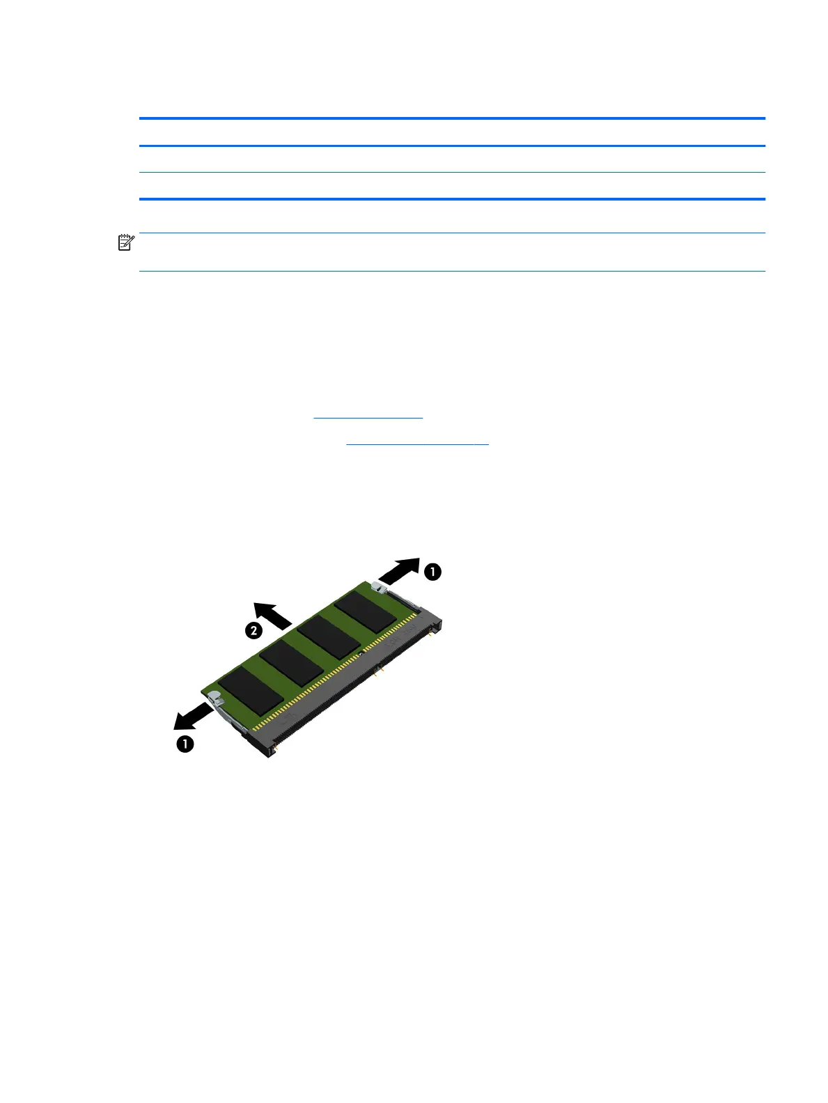 2. Remove the memory module (2) by pulling it away from the slot at an angle.