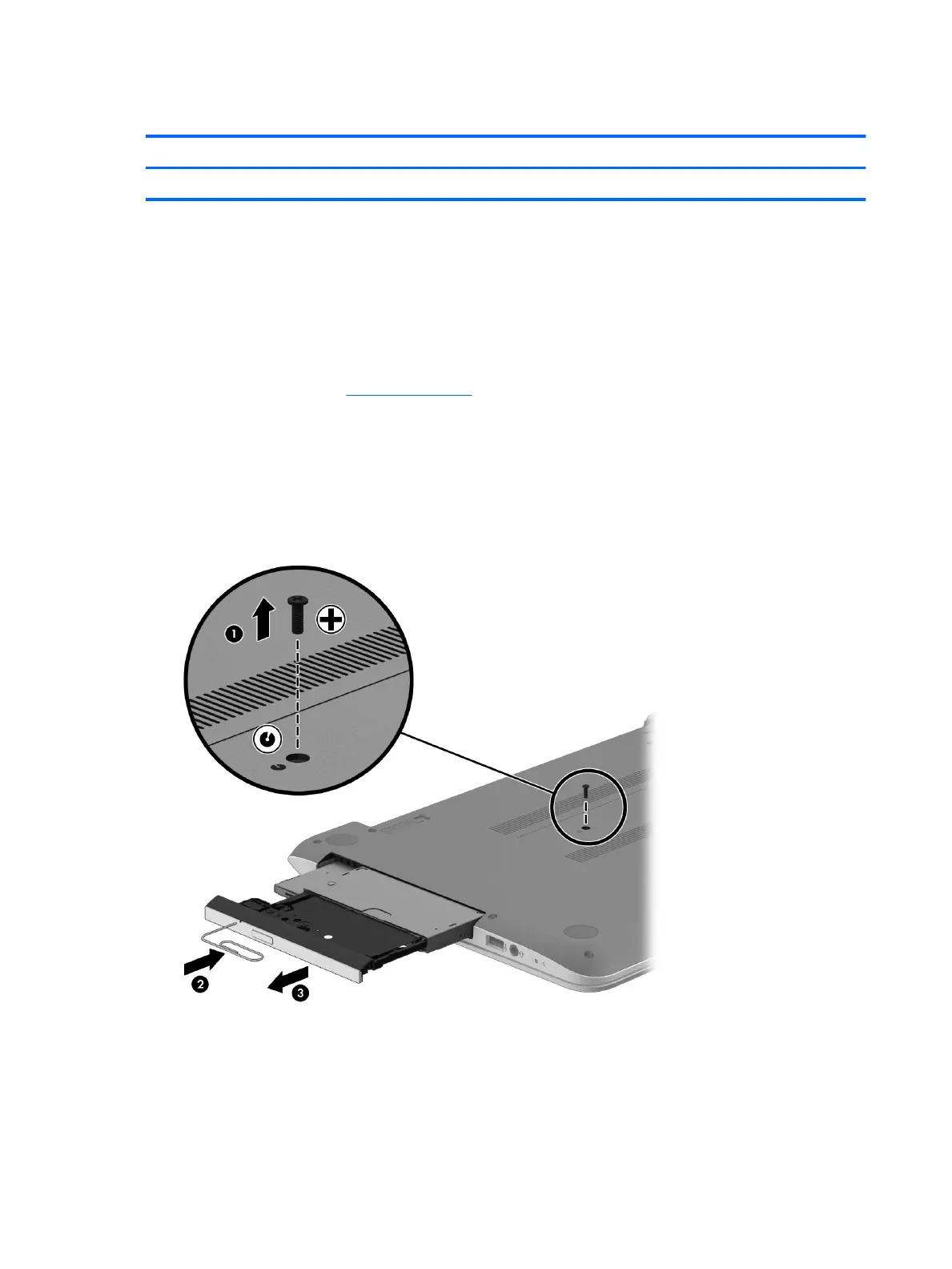 1. Remove the Phillips M2.5×6.5 screw (1) that secures the optical drive to the computer.