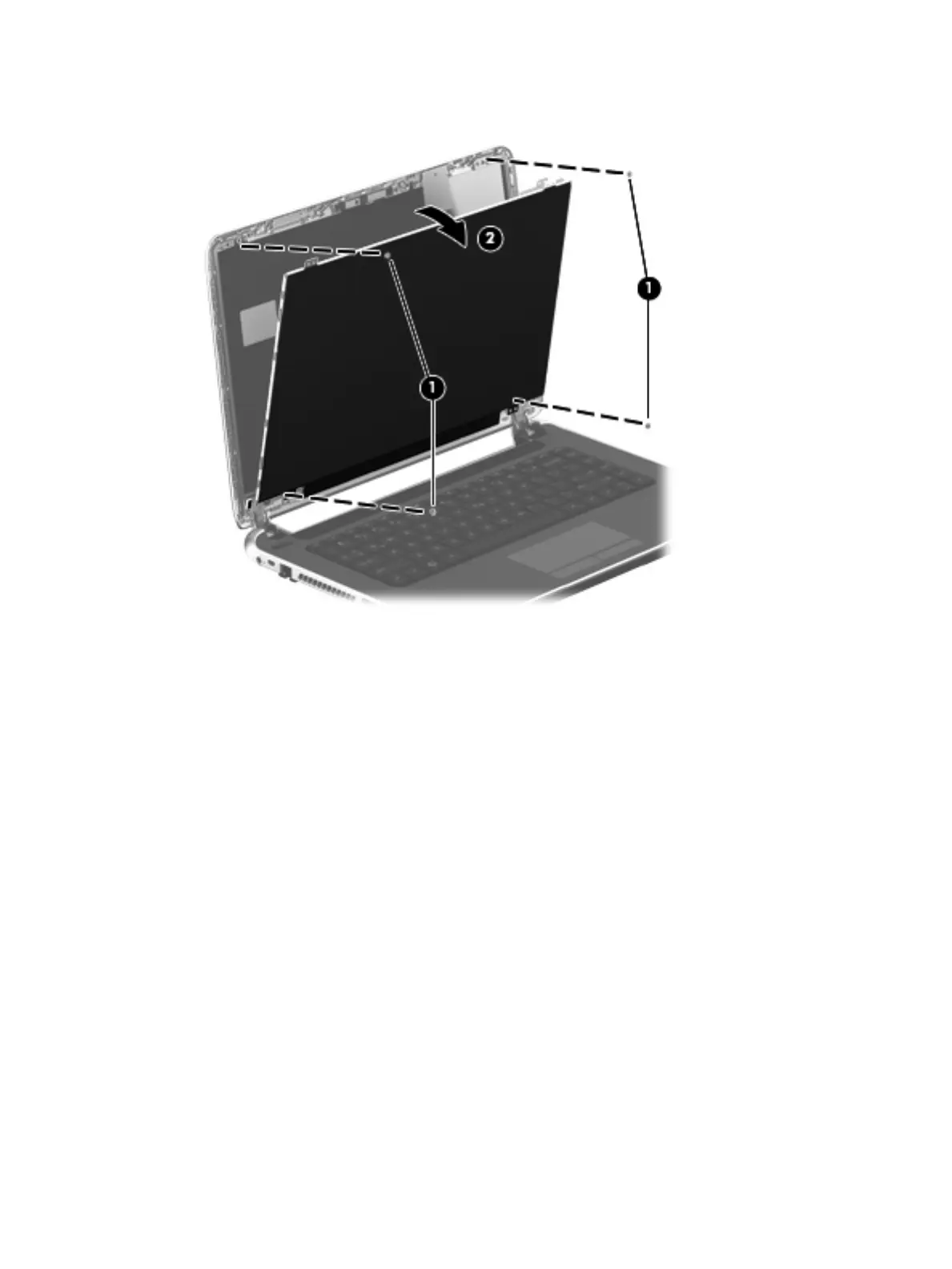 6. Swing the top edge of the display panel (2) forward until it rests on the keyboard.